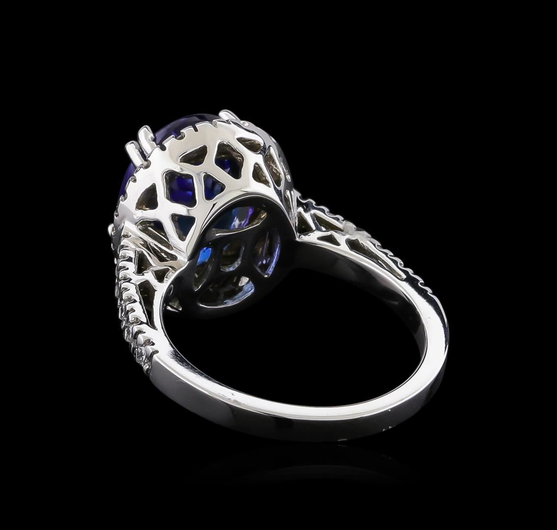 One electronically tested 14KT white gold lady's cast fashion ring with a basket halo with a bright polish finish. The featured lady's ring has a shank measuring 2.20 millimeters wide. Identified with markings of "14K". Condition is new, good workmanship. Containing: One prong set oval modified brilliant cut natural tanzanite, measuring 12.02 x 9.11 x 6.83mm, 6%. bulge factor, approximate weight of 5.60ct., clarity is eye clean, type I, medium dark, moderately strong, violetish blue color, (GIA vB 6/4), cut is very good. Transmitting light with no distortion, transparent. Colored gemstones are presumed to have been subjected to commonly used enhancement processes. Graded in the setting. Twenty-Eight prong set round brilliant cut diamonds, measuring 1.70 - 1.65 x 1.04mm (depth est.) approximate total weight of 28 Stones = 0.50ct. Graded in the setting. Clarity: VS-2 to SI-1. Color: H - I. Cut Good. Total Weight of Colored Stones 5.60ct. Total Weight of Diamonds 0.50ct. Total Weight of Ring 6.90gm. GAS Appraised at $11,925.00.