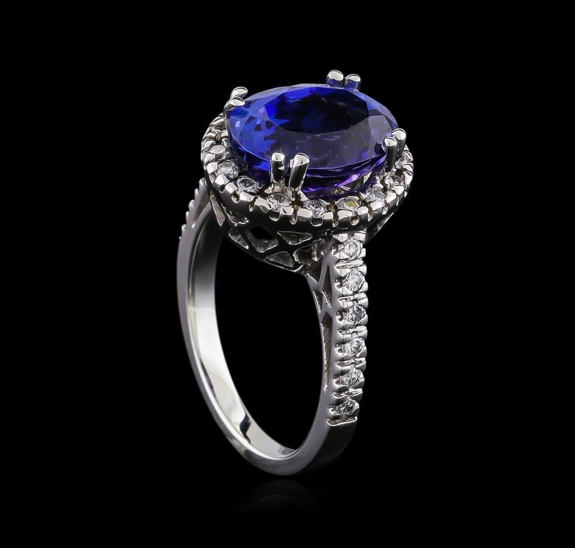 One electronically tested 14KT white gold lady's cast fashion ring with a basket halo with a bright polish finish. The featured lady's ring has a shank measuring 2.20 millimeters wide. Identified with markings of "14K". Condition is new, good workmanship. Containing: One prong set oval modified brilliant cut natural tanzanite, measuring 12.02 x 9.11 x 6.83mm, 6%. bulge factor, approximate weight of 5.60ct., clarity is eye clean, type I, medium dark, moderately strong, violetish blue color, (GIA vB 6/4), cut is very good. Transmitting light with no distortion, transparent. Colored gemstones are presumed to have been subjected to commonly used enhancement processes. Graded in the setting. Twenty-Eight prong set round brilliant cut diamonds, measuring 1.70 - 1.65 x 1.04mm (depth est.) approximate total weight of 28 Stones = 0.50ct. Graded in the setting. Clarity: VS-2 to SI-1. Color: H - I. Cut Good. Total Weight of Colored Stones 5.60ct. Total Weight of Diamonds 0.50ct. Total Weight of Ring 6.90gm. GAS Appraised at $11,925.00.