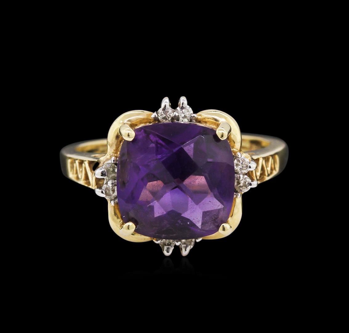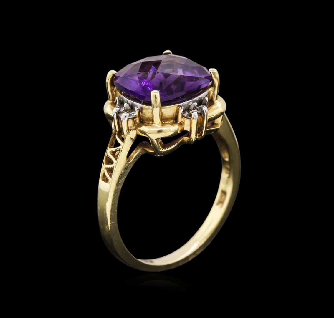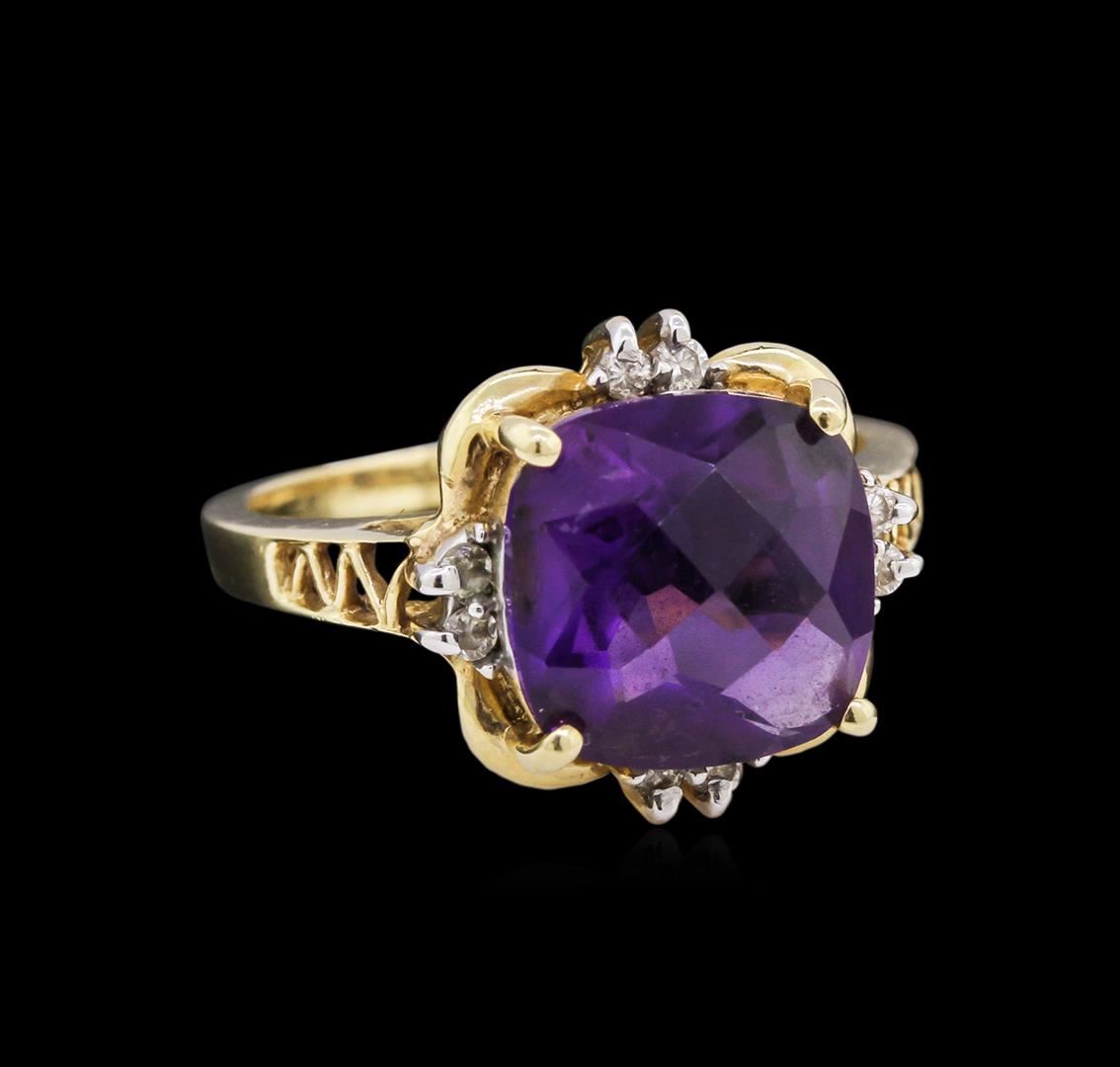 5.60ct Amethyst and Diamond Ring - 14KT Yellow Gold. 4.7 grams total weight; 5.6 carat cushion cut amethyst; .08 pts of diamonds (8 diamonds .01 pt each); Size 7.