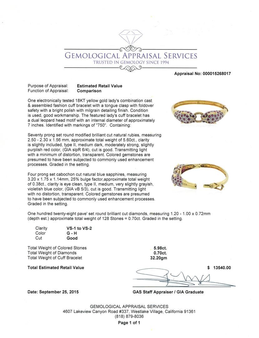 One electronically tested 18KT yellow gold lady's combination cast & assembled fashion cuff bracelet with a tongue clasp with foldover safety with a bright polish with milgrain detailing finish. The featured lady's cuff bracelet has a dual leopard head motif with an internal diameter of approximately 7 inches. Identified with markings of "750". Condition is used, good workmanship. Containing: Seventy prong set round modified brilliant cut natural rubies, measuring 2.50 - 2.30 x 1.56 mm, approximate total weight of 5.60ct., clarity is slightly included, type II, medium dark, moderately strong, slightly purplish red color, (GIA slpR 6/4), cut is good. Transmitting light with a minimum of distortion, transparent. Colored gemstones are presumed to have been subjected to commonly used enhancement processes. Graded in the setting. Four prong set cabochon cut natural blue sapphires, measuring 3.20 x 1.75 x 1.14mm, 25% bulge factor, approximate total weight of 0.38ct., clarity is eye clean, type II, medium, very slightly grayish, violetish blue color, (GIA vB 5/3), cut is good. Transmitting light with no distortion, transparent. Colored gemstones are presumed to have been subjected to commonly used enhancement processes. Graded in the setting. One Hundred Twenty-Eight pave' set round brilliant cut diamonds, measuring 1.20 - 1.00 x 0.72mm (depth est.) approximate total weight of 128 Stones = 0.70ct. Graded in the setting. Clarity: VS-1 to VS-2. Color: G - Good. Total Weight of Colored Stones 5.98ct. Total Weight of Diamonds 0.70ct. Total Weight of Cuff Bracelet 32.20gm at $13540.00.. GAS Appraised at $13,540.00.