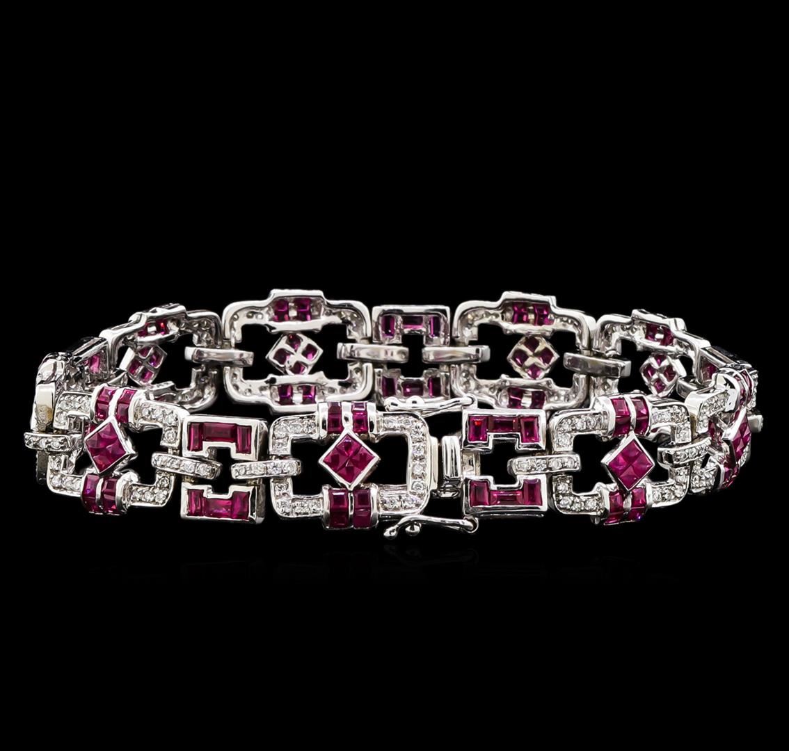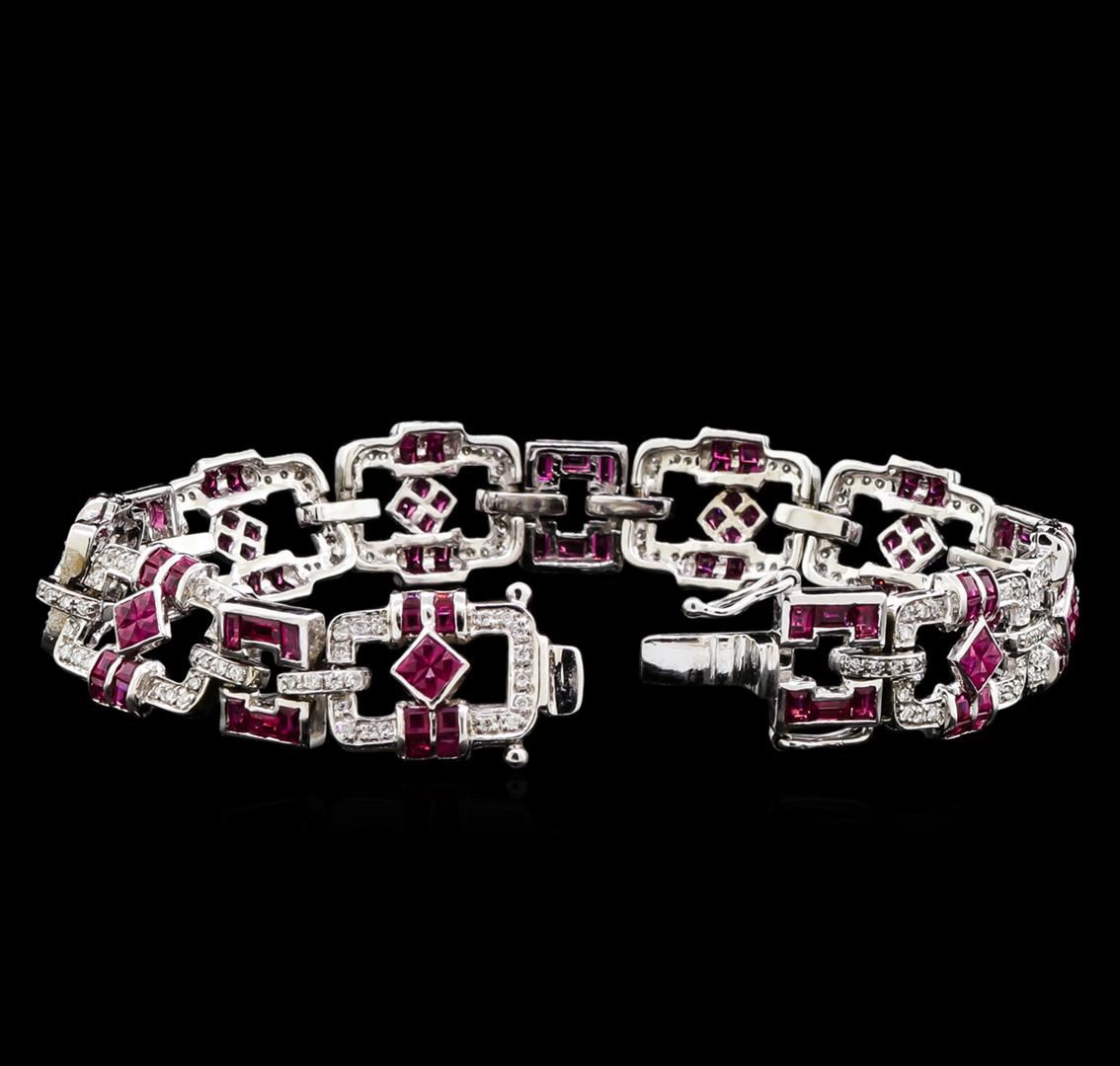 One electronically tested 18KT white gold lady's combination cast & assembled fashion bracelet with a tongue clasp with foldover safety with a bright polish finish. The featured ladies' bracelet measures 7.00 inches in length with a 12 millimeter width. Identified with markings of "750". Condition is used, good workmanship. Containing: Thirty-six invisible set princess modified brilliant cut natural rubies, measuring 2.00 x 1.90 x 1.30mm, approximate total weight of 1.80ct., clarity is slightly included, type II, medium, moderately strong, red color, (GIA R 5/4), cut is very good. Colored gemstones are presumed to have been subjected to commonly used enhancement processes. Graded in the setting. Seventy-two channel set square emerald step cut natural rubies, measuring 1.70 x 1.70 x 1.20mm, approximate total weight of 2.01ct., clarity is eye clean, type II, medium, moderately strong, red color, (GIA R 5/4), cut is very good. Colored gemstones are presumed to have been subjected to commonly used enhancement processes. Graded in the setting. One Hundred Ninety-Six prong set round brilliant cut diamonds, measuring 1.40 - 1.35 x 0.86mm (depth est.) approximate total weight of 196 Stones = 1.96ct. Graded in the setting. Clarity: VS-2 to SI-1. Color: G - Good Thirty channel set baguette step cut natural rubies, measuring 2.80 x 1.70 x 1.11mm, approximate total weight of 1.80ct., clarity is eye clean, type II, medium, moderately strong, red color, (GIA R 5/4), cut is very good. Colored gemstones are presumed to have been subjected to commonly used enhancement processes. Graded in the setting. Total Weight of Colored Stones 5.61ct. Total Weight of Diamonds 1.96ct. Total Weight of Bracelet 24.70gm. GAS Appraised at $16,085.00.