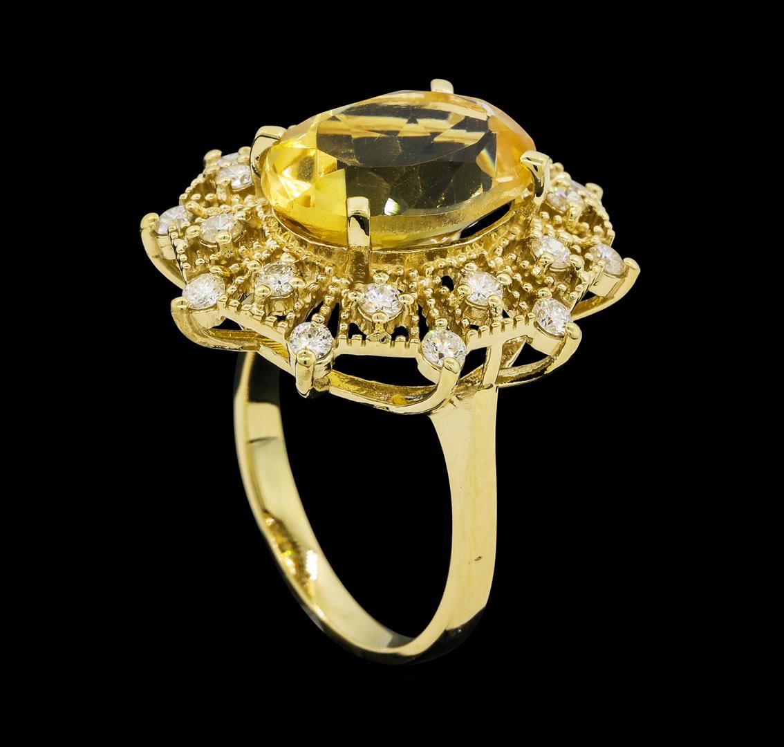 One Citrine Quartz and Diamond Ring including: 14KT Yellow Gold weighing a total of 5.76 grams, Citrine Quartz weighing a total of 5.62ct and 20 Diamonds weighing a total of 0.65ctw.