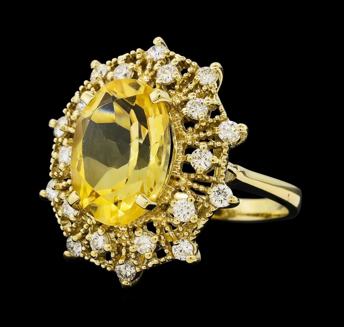 One Citrine Quartz and Diamond Ring including: 14KT Yellow Gold weighing a total of 5.76 grams, Citrine Quartz weighing a total of 5.62ct and 20 Diamonds weighing a total of 0.65ctw.
