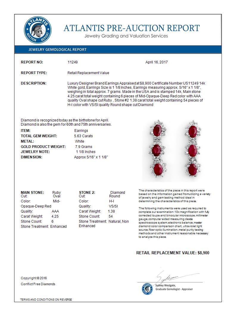 5.63 CTW Ruby & Diamond Earrings 14K White Gold ---- Luxury Designer Brand Earrings Appraised Retail Price at $8,900 ---- SKU Number US11249 14k White gold Earrings Size is 1 1/8 Inches, Earrings measuring approx. 5/16" x 1 1/8", weighing in total approx. 7 grams. Made in the USA and is stamped 14k, Main stone 4.25 carat total weight containing 6 pieces of Mid-Opaque-Deep Red color with AAA quality Oval shape cut Ruby , Stone #2 1.38 carat total weight containing 54 pieces of H-I color with VS/SI quality Round shape cut