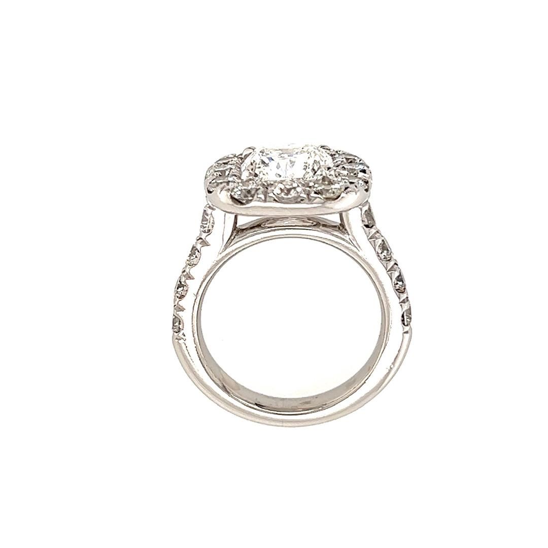 One electronically tested platinum lady's combination cast & assembled wedding ring with a halo motif with a bright polish finish. Condition is like new, good workmanship. The featured lady's ring has a shank measuring 3.50mm in width Containing: One prong set cushion cut diamond, measuring 8.93 x 8.36 x 5.69mm (depth est.) approximate weight of 3.20ct with a medium blue fluorescence. Graded loose prior to setting in the GIA Laboratory, Report #6222298598. Laser inscribed. Color E Clarity SI-2 Cut Excellent Eight prong set round brilliant cut diamonds, measuring 3.30 - 3.15 x 2.00mm (depth est.) approximate total weight of 8 Stones = 1.01ct. Graded in the setting. Color G-H Clarity VS-2 to SI-1 Cut Very Good Twelve prong set round brilliant cut diamonds, measuring 3.20 - 3.10 x 1.95mm (depth est.) approximate total weight of 12 Stones = 1.42ct. Graded in the setting. Color G-H Clarity VS-2 to SI-1 Cut Very Good Total Weight of Diamonds 5.63ct. Total Weight of Ring 15.80gm Total Estimated Retail Value $ 123750.00