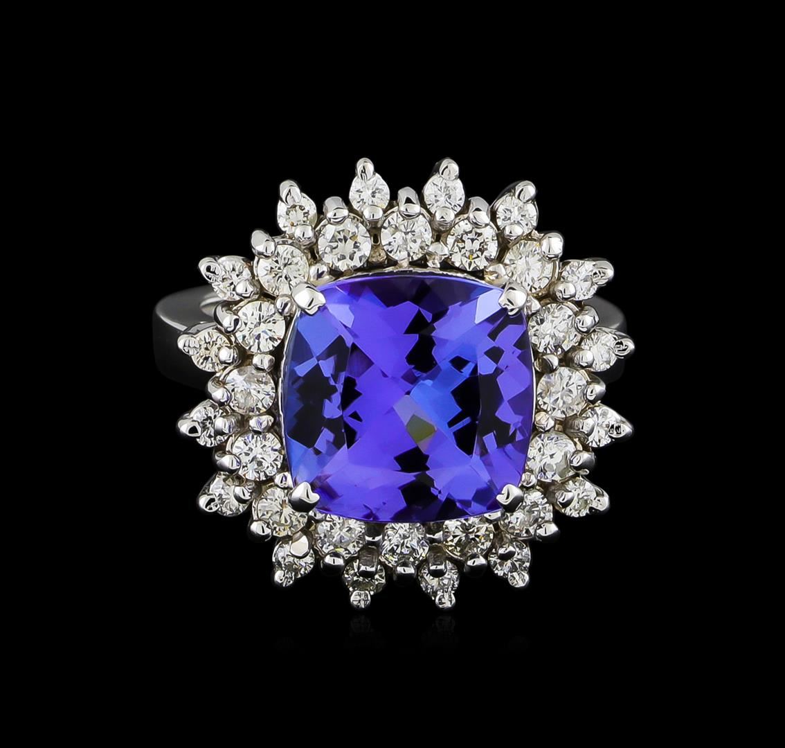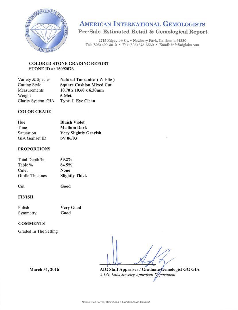 One electronically tested 14KT white gold ladies cast tanzanite and diamond ring with a bright polish finish. The featured tanzanite is set within a diamond floret supported by a ribbed under gallery, completed by a three millimeter wide band. Identified with markings of "14K". Condition is new, good workmanship. Containing: One prong set square cushion mixed cut natural tanzanite, measuring 10.70 x 10.60 x 6.30mm, approximate weight of 5.63ct., clarity is eye clean, type I, medium dark, very slightly grayish, bluish violet color, (GIA bV 6/3), cut is good. Transmitting light with no distortion, transparent. Colored Stone Grading Report attached. Graded in the setting. Tanzanite is a very rare gemstone that is only found in the country of Tanzania. Originally discovered in 1967. Tiffany & Company, named the stone Tanzanite. It is found in the Usumburu Mountains that border the Umba Valley of northern Tanzania. Tanzanite occurs in gray, brown, violet, blue, reddish-purple, & green. The gem is interesting because of its exceptional pleochroism. Rotated in different directions a tanzanite will exhibit multiple changes of color. Tanzanite has a low tolerance to ultrasonic cleaning, and should not be cleaned using this method. Sixteen prong set round brilliant cut diamonds, measuring 2.20 - 2.20 x 1.32mm (depth est.) approximate total weight of 16 Stones = 0.62ct. Graded in the setting. Clarity: I-1 to I-2. Color: G - I Sixteen prong set round brilliant cut diamonds, measuring 1.70 - 1.70 x 1.02mm (depth est.) approximate total weight of 16 Stones = 0.29ct. Graded in the setting. Clarity: SI-2 to I-2. Color: G - I. Total Weight of Colored Stones 5.63ct. Total Weight of Diamonds 0.91ct. Total Weight of Ring 10.84gm. AIG Appraised at $15,810.00.