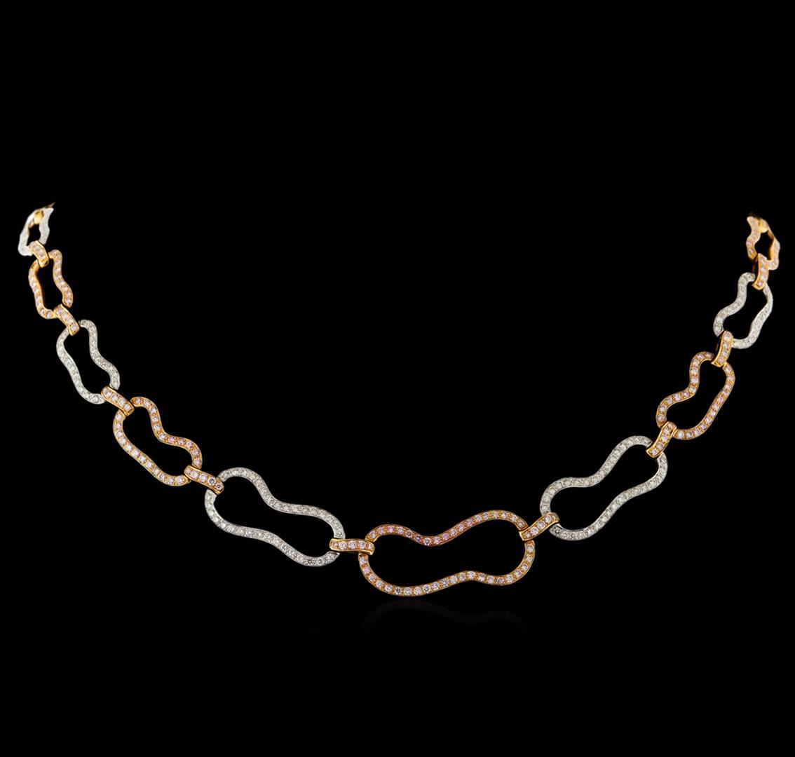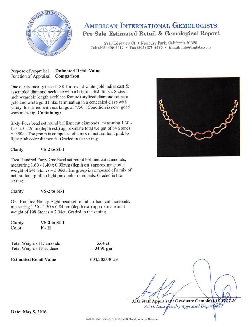 One electronically tested 18KT rose and white gold ladies cast & assembled diamond necklace with a bright polish finish. Sixteen inch wearable length necklace features stylized diamond set rose gold and white gold links, terminating in a concealed clasp with safety. Identified with markings of 750. Condition is new, good workmanship. Containing: Sixty-Four bead set round brilliant cut diamonds, measuring 1.30 - 1.10 x 0.72mm (depth est.) approximate total weight of 64 Stones = 0.50ct. The group is composed of a mix of natural faint pink to light pink color diamonds. Graded in the setting. Clarity: VS-2 to SI-1 Two Hundred Forty-One bead set round brilliant cut diamonds, measuring 1.60 - 1.40 x 0.90mm (depth est.) approximate total weight of 241 Stones = 3.06ct. The group is composed of a mix of natural faint pink to light pink color diamonds. Graded in the setting. Clarity: VS-2 to SI-1 One Hundred Ninety-Eight bead set round brilliant cut diamonds, measuring 1.50 - 1.30 x 0.84mm (depth est.) approximate total weight of 198 Stones = 2.08ct. Graded in the setting. Clarity: VS-2 to SI-1. Color: F - H. Total Weight of Diamonds 5.64ct. Total Weight of Necklace 34.91gm. AIG Appraised at $31,305.00.
