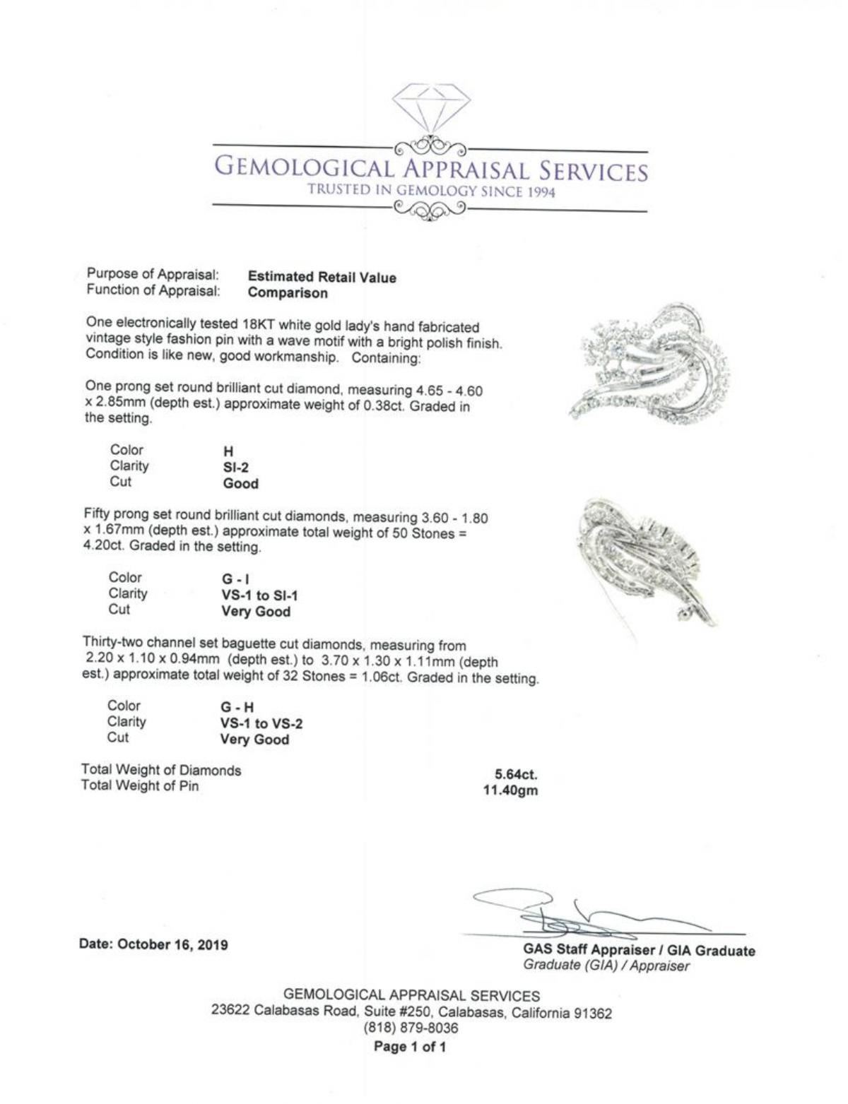 One electronically tested 18KT white gold lady's hand fabricated vintage style fashion pin with a wave motif with a bright polish finish. Condition is Good. Containing: One prong set round brilliant cut diamond, measuring 4.65 - 4.60 x 2.85mm (depth est.) approximate weight of 0.38ct. Graded in the setting. Color H Clarity SI-2 Cut Good Fifty prong set round brilliant cut diamonds, measuring 3.60 - 1.80 x 1.67mm (depth est.) approximate total weight of 50 Stones = 4.20ct. Graded in the setting. Color G - I Clarity VS-1 to SI-1 Cut Very Good Thirty-Two channel set baguette cut diamonds, measuring from 2.20 x 1.10 x 0.94mm (depth est.) to 3.70 x 1.30 x 1.11mm (depth est.) approximate total weight of 32 Stones = 1.06ct. Graded in the setting. Color G - H Clarity VS-1 to VS-2 Cut Very Good. Total Weight of Diamonds 5.64ct.. Total Weight of Pin 11.40gm GAS Appraised at  $13170.00. GAS Appraised.