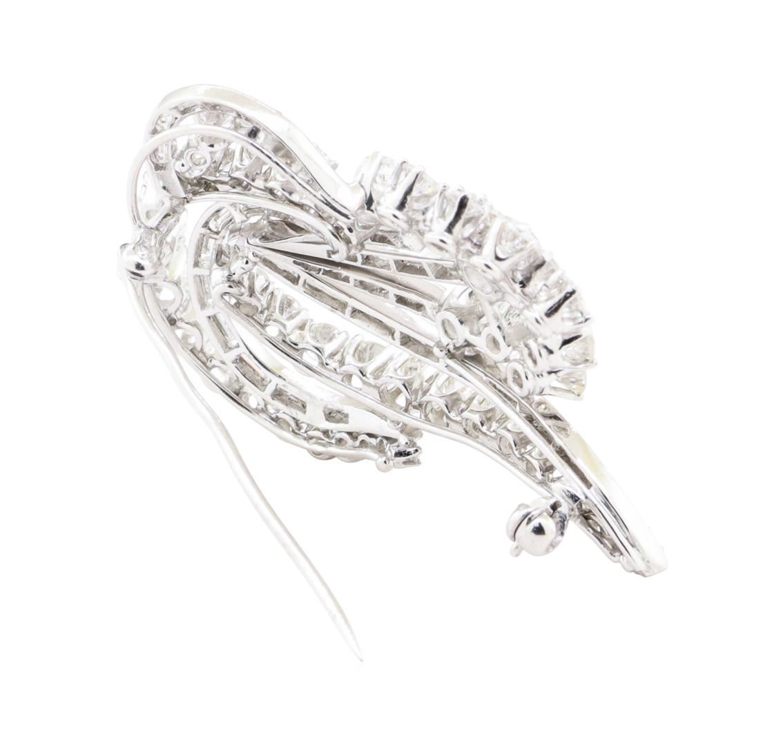 One electronically tested 18KT white gold lady's hand fabricated vintage style fashion pin with a wave motif with a bright polish finish. Condition is Good. Containing: One prong set round brilliant cut diamond, measuring 4.65 - 4.60 x 2.85mm (depth est.) approximate weight of 0.38ct. Graded in the setting. Color H Clarity SI-2 Cut Good Fifty prong set round brilliant cut diamonds, measuring 3.60 - 1.80 x 1.67mm (depth est.) approximate total weight of 50 Stones = 4.20ct. Graded in the setting. Color G - I Clarity VS-1 to SI-1 Cut Very Good Thirty-Two channel set baguette cut diamonds, measuring from 2.20 x 1.10 x 0.94mm (depth est.) to 3.70 x 1.30 x 1.11mm (depth est.) approximate total weight of 32 Stones = 1.06ct. Graded in the setting. Color G - H Clarity VS-1 to VS-2 Cut Very Good. Total Weight of Diamonds 5.64ct.. Total Weight of Pin 11.40gm GAS Appraised at  $13170.00. GAS Appraised.