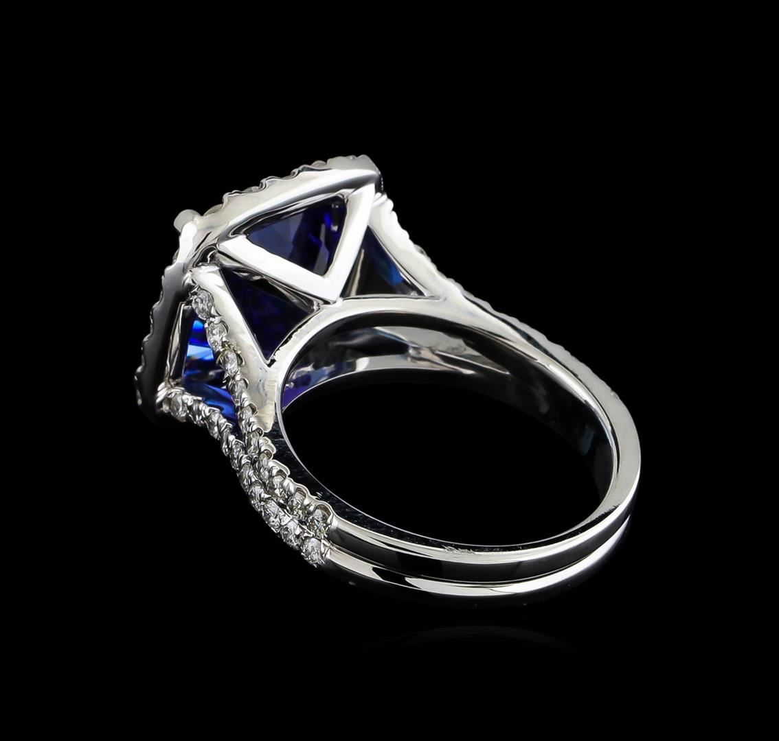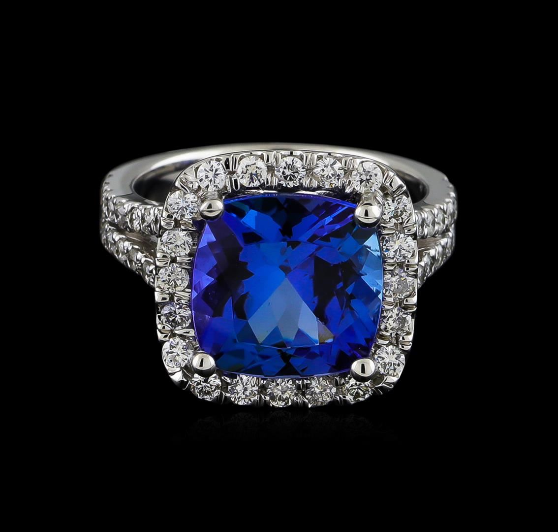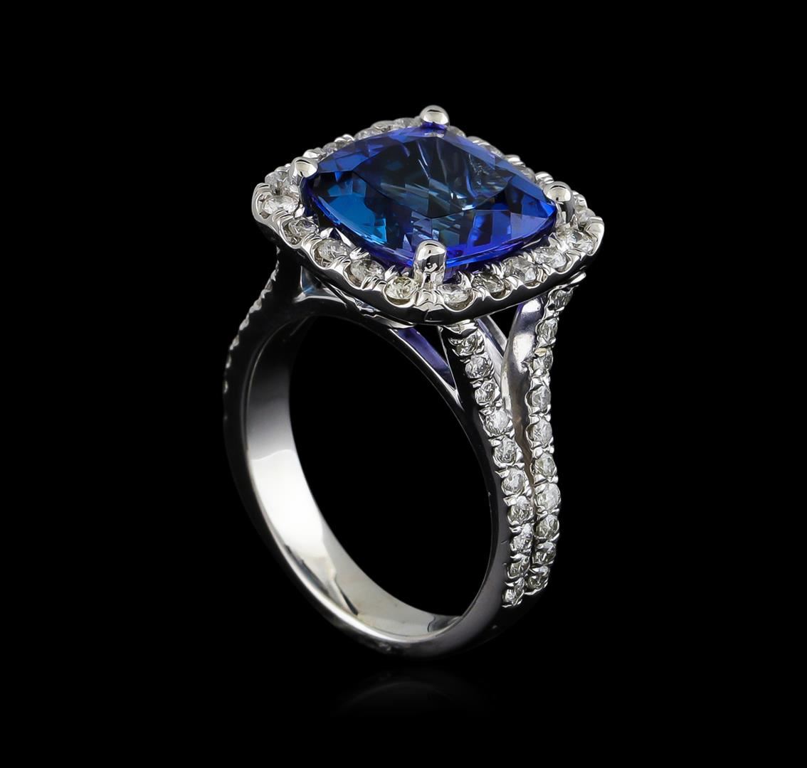 One electronically tested 14KT white gold ladies cast tanzanite and diamond ring with a bright polish finish. The featured tanzanite is set within a diamond bezel supported by diamond set split shoulders, completed by a three millimeter wide grooved band. Identified with markings of "14K". Condition is new, good workmanship. Containing: One prong set square cushion mixed cut natural tanzanite, measuring 10.50 x 10.50 x 6.50mm, approximate weight of 5.64ct., clarity is eye clean, type I, dark, moderately strong, violetish blue color, (GIA vB 7/4), cut is good. Transmitting light with no distortion, transparent. Colored Stone Grading Report attached. Graded in the setting. Tanzanite is a very rare gemstone that is only found in the country of Tanzania. Originally discovered in 1967. Tiffany & Company, named the stone Tanzanite. It is found in the Usumburu Mountains that border the Umba Valley of northern Tanzania. Tanzanite occurs in gray, brown, violet, blue, reddish-purple, & green. The gem is interesting because of its exceptional pleochroism. Rotated in different directions a tanzanite will exhibit multiple changes of color. Tanzanite has a low tolerance to ultrasonic cleaning, and should not be cleaned using this method. Twenty prong set round brilliant cut diamonds, measuring 1.70 - 1.70 x 1.02mm (depth est.) approximate total weight of 20 Stones = 0.36ct. Graded in the setting. Clarity: SI-2 to I-2. Color: G - I Forty prong set round brilliant cut diamonds, measuring 1.40 - 1.40 x 0.84mm (depth est.) approximate total weight of 40 Stones = 0.40ct. Graded in the setting. Clarity: SI-2 to I-2. Color: G - I. Total Weight of Colored Stones 5.64ct. Total Weight of Diamonds 0.76ct. Total Weight of Ring 7.06gm. AIG Appraised at $15,705.00.
