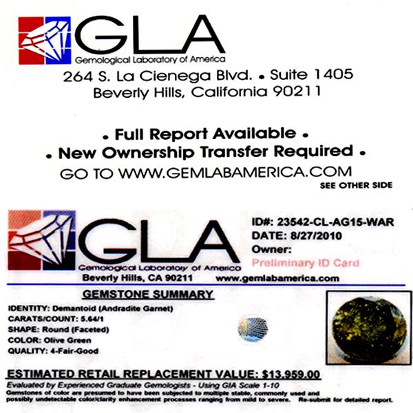 Excellent olive green colored specimen round cut; lab quality evaluation 4; treatment as noted; Gem Guide wholesale $2820-$4230; full retail appraisal $13959; full lab evaluation available