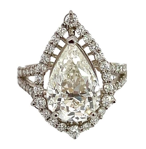 One electronically tested 14KT white gold lady's combination cast & assembled fashion teardrop motif wedding ring with a split shank basket halo with a bright polish finish. The featured lady's ring has a shank measuring 1.90 millimeters wide. Identified with markings of "14K". Condition is new, good workmanship.Containing: One pear shaped cut diamond, measuring 13.01 x 8.61 x 7.31mm (depth est.), 4.00% GTCF approximate weight of 5.03ct. Graded loose prior to setting in the EGL USA Laboratory, Report #US925647801D.Color HClarity SI-1 Cut Very Good Four prong set round brilliant cut diamonds, measuring 2.10 - 2.00 x 1.27mm (depth est.) approximate total weight of 4 Stones = 0.13ct. Graded in the setting.Color G - HClarity VS-2 to SI-1 Cut Very Good Twenty prong set round brilliant cut diamonds, measuring 1.60 - 1.50 x 0.96mm (depth est.) approximate total weight of 20 Stones = 0.29ct. Graded in the setting.Color G - HClarity VS-2 to SI-1 Cut Very Good Twenty-Eight prong set round brilliant cut diamonds, measuring 1.30 - 1.20 x 0.76mm (depth est.) approximate total weight of 28 Stones = 0.20ct. Graded in the setting.Color G - HClarity VS-2 to SI-1 Cut Very Good Total Weight of Diamonds