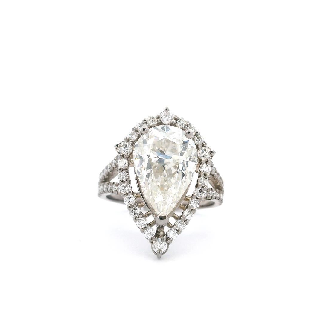 One electronically tested 14KT white gold lady's combination cast & assembled fashion teardrop motif wedding ring with a split shank basket halo with a bright polish finish. The featured lady's ring has a shank measuring 1.90 millimeters wide. Identified with markings of "14K". Condition is new, good workmanship.Containing: One pear shaped cut diamond, measuring 13.01 x 8.61 x 7.31mm (depth est.), 4.00% GTCF approximate weight of 5.03ct. Graded loose prior to setting in the EGL USA Laboratory, Report #US925647801D.Color HClarity SI-1 Cut Very Good Four prong set round brilliant cut diamonds, measuring 2.10 - 2.00 x 1.27mm (depth est.) approximate total weight of 4 Stones = 0.13ct. Graded in the setting.Color G - HClarity VS-2 to SI-1 Cut Very Good Twenty prong set round brilliant cut diamonds, measuring 1.60 - 1.50 x 0.96mm (depth est.) approximate total weight of 20 Stones = 0.29ct. Graded in the setting.Color G - HClarity VS-2 to SI-1 Cut Very Good Twenty-Eight prong set round brilliant cut diamonds, measuring 1.30 - 1.20 x 0.76mm (depth est.) approximate total weight of 28 Stones = 0.20ct. Graded in the setting.Color G - HClarity VS-2 to SI-1 Cut Very Good Total Weight of Diamonds