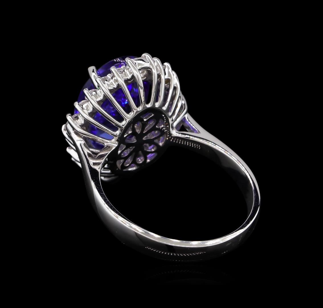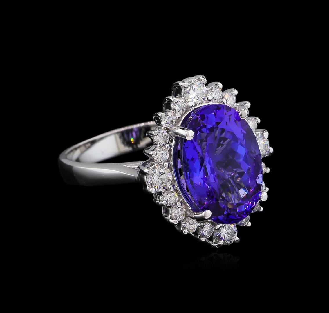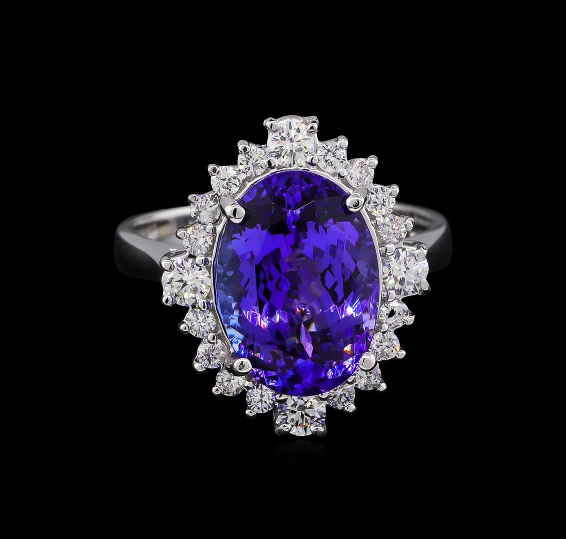 One electronically tested 14KT white gold lady's cast fashion ring with a basket halo with a bright polish finish. The featured lady's ring has a shank measuring 2.86 millimeters wide. Identified with markings of "K14". Condition is new, good workmanship. Containing: One prong set oval modified brilliant cut natural tanzanite, measuring 12.81 x 9.08 x 6.90mm, approximate weight of 5.65ct., clarity is eye clean, type I, medium, very slightly grayish, violetish blue color, (GIA vB 5/3), cut is excellent. Transmitting light with no distortion, transparent. Colored gemstones are presumed to have been subjected to commonly used enhancement processes. Graded in the setting. Four prong set round brilliant cut diamonds, measuring 2.80 - 2.70 x 1.71mm (depth est.) approximate total weight of 4 Stones = 0.32ct. Graded in the setting. Clarity: VS-2 to SI-1. Color: H - I. Cut Very Good Sixteen prong set round brilliant cut diamonds, measuring 1.70 - 1.65 x 1.04mm (depth est.) approximate total weight of 16 Stones = 0.33ct. Graded in the setting. Clarity: SI-1 to SI-2. Color: G - Good. Total Weight of Colored Stones 5.65ct. Total Weight of Diamonds 0.65ct. Total Weight of Ring 6.20gm. GAS Appraised at $11,600.00.