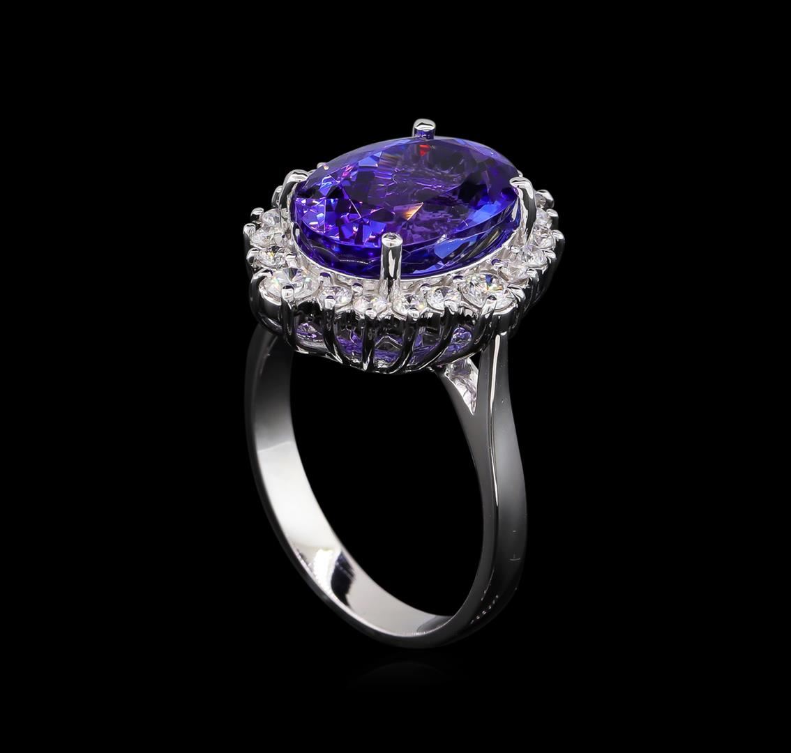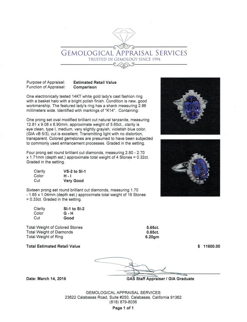 One electronically tested 14KT white gold lady's cast fashion ring with a basket halo with a bright polish finish. The featured lady's ring has a shank measuring 2.86 millimeters wide. Identified with markings of "K14". Condition is new, good workmanship. Containing: One prong set oval modified brilliant cut natural tanzanite, measuring 12.81 x 9.08 x 6.90mm, approximate weight of 5.65ct., clarity is eye clean, type I, medium, very slightly grayish, violetish blue color, (GIA vB 5/3), cut is excellent. Transmitting light with no distortion, transparent. Colored gemstones are presumed to have been subjected to commonly used enhancement processes. Graded in the setting. Four prong set round brilliant cut diamonds, measuring 2.80 - 2.70 x 1.71mm (depth est.) approximate total weight of 4 Stones = 0.32ct. Graded in the setting. Clarity: VS-2 to SI-1. Color: H - I. Cut Very Good Sixteen prong set round brilliant cut diamonds, measuring 1.70 - 1.65 x 1.04mm (depth est.) approximate total weight of 16 Stones = 0.33ct. Graded in the setting. Clarity: SI-1 to SI-2. Color: G - Good. Total Weight of Colored Stones 5.65ct. Total Weight of Diamonds 0.65ct. Total Weight of Ring 6.20gm. GAS Appraised at $11,600.00.