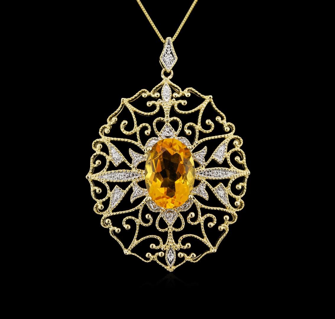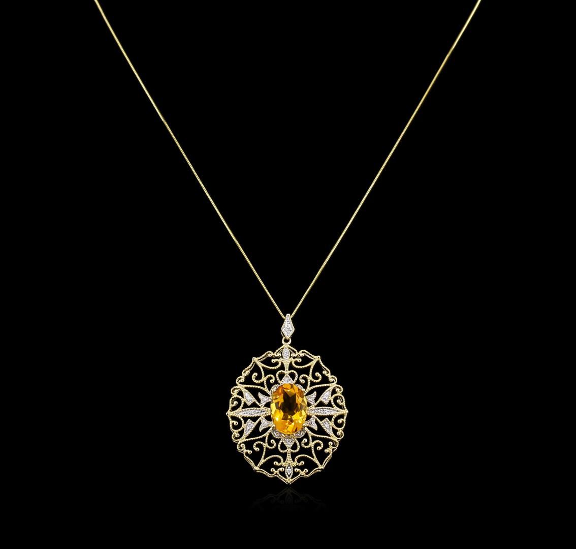 One pendant with chain featuring: 14KT yellow gold weighing 8.00 grams containing one citrine center stone with a total weight of 5.65ct and diamonds with a total weight of 0.20ct.