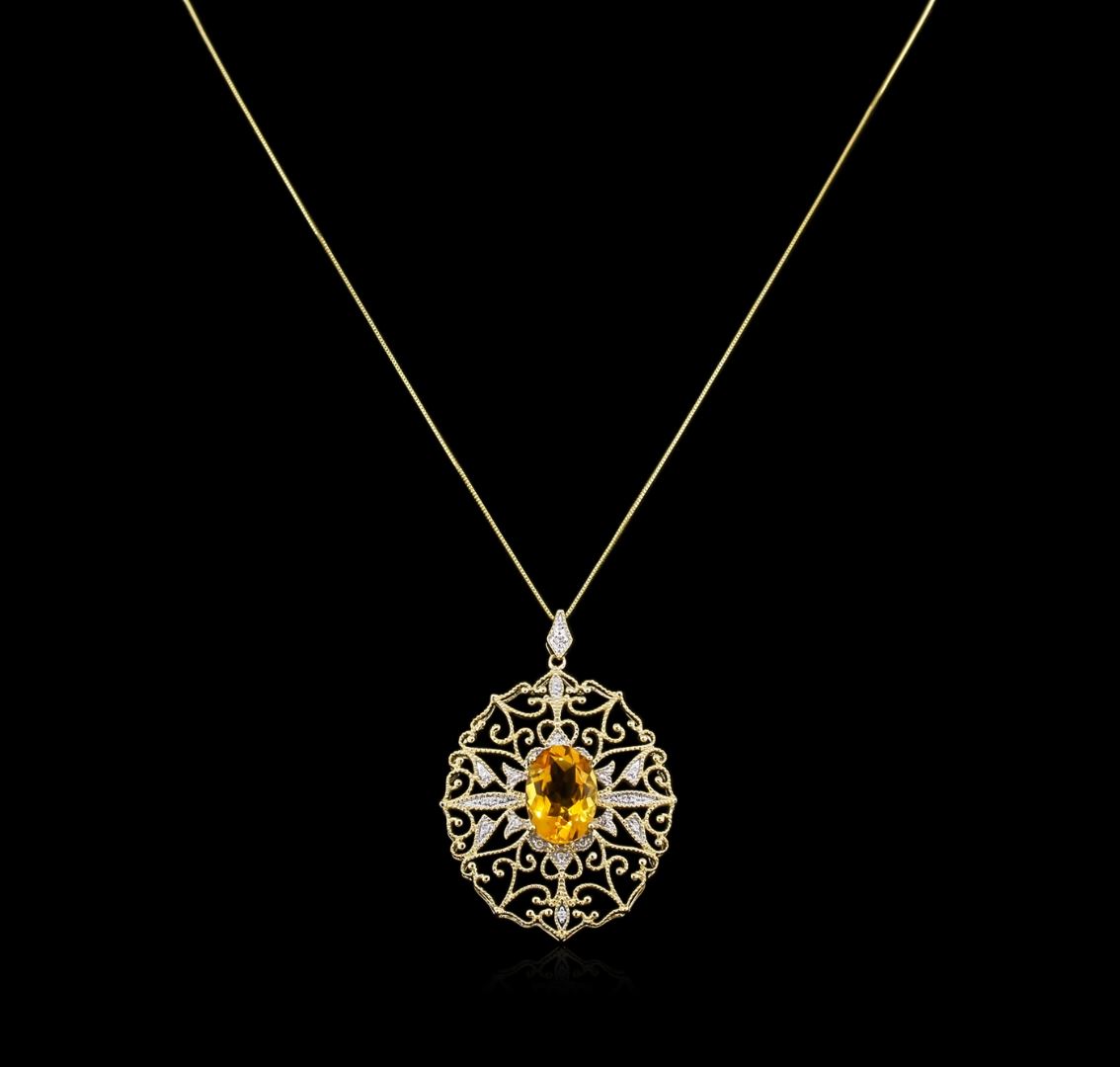 One pendant with chain featuring: 14KT yellow gold weighing 8.00 grams containing one citrine center stone with a total weight of 5.65ct and diamonds with a total weight of 0.20ct.