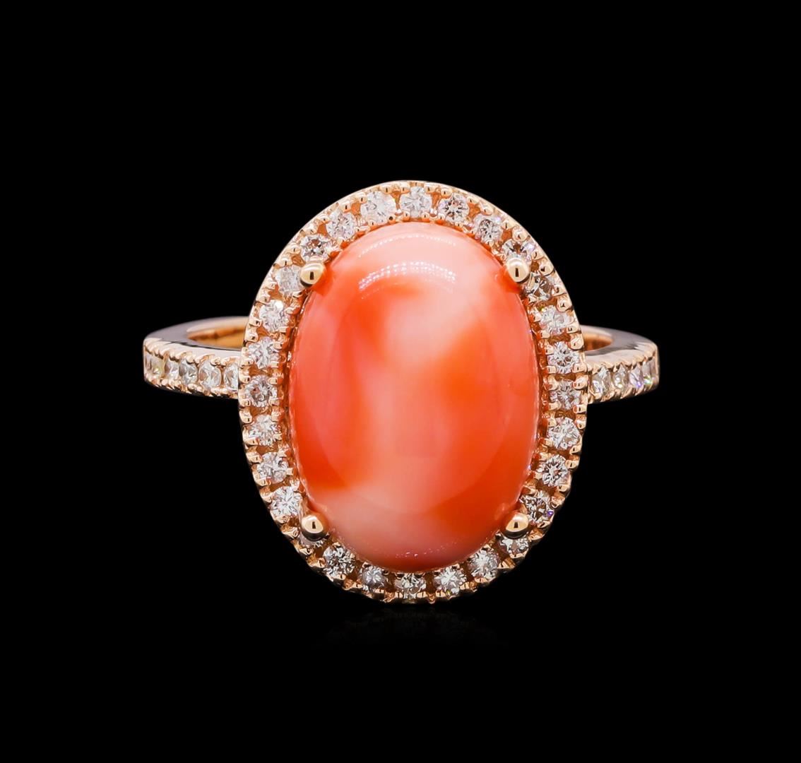 One ring featuring: 14KT rose gold weighing 4.98 grams containing one coral weighing 5.66ct and diamonds weighing 0.40ctw.