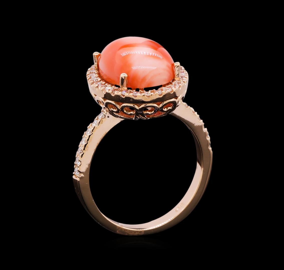 One ring featuring: 14KT rose gold weighing 4.98 grams containing one coral weighing 5.66ct and diamonds weighing 0.40ctw.