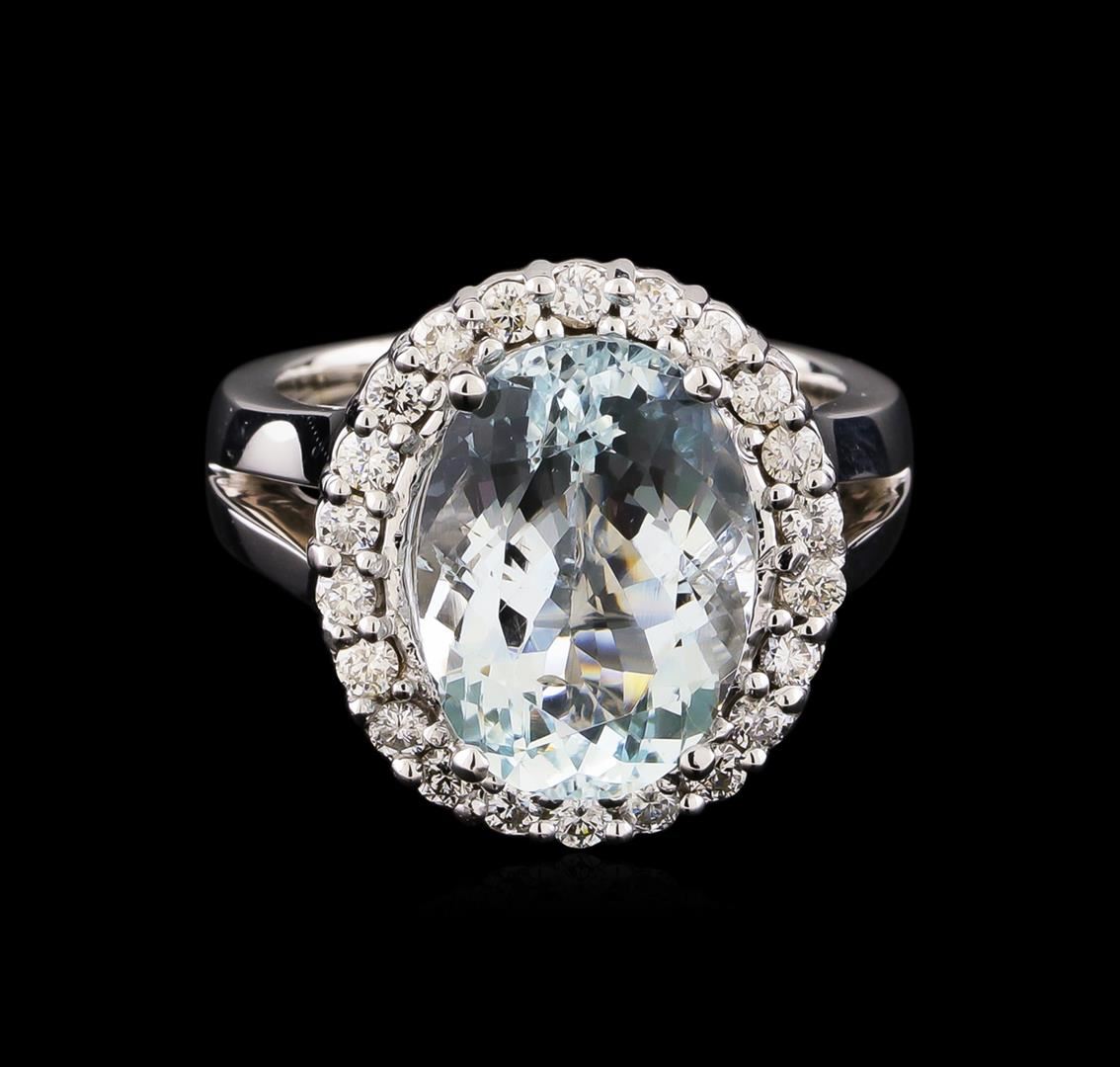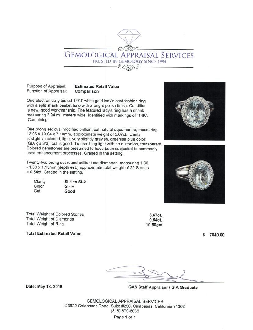 One electronically tested 14KT white gold lady's cast fashion ring with a split shank basket halo with a bright polish finish. The featured lady's ring has a shank measuring 3.94 millimeters wide. Identified with markings of "14K". Condition is new, good workmanship. Containing: One prong set oval modified brilliant cut natural aquamarine, measuring 13.96 x 10.04 x 7.10mm, approximate weight of 5.67ct., clarity is slightly included, light, very slightly grayish, greenish blue color, (GIA gB 3/3), cut is good. Transmitting light with no distortion, transparent. Colored gemstones are presumed to have been subjected to commonly used enhancement processes. Graded in the setting. Twenty-Two prong set round brilliant cut diamonds, measuring 1.90 - 1.80 x 1.15mm (depth est.) approximate total weight of 22 Stones = 0.54ct. Graded in the setting. Clarity: SI-1 to SI-2. Color: G - Good. Total Weight of Colored Stones 5.67ct. Total Weight of Diamonds 0.54ct. Total Weight of Ring 10.80gm. GAS Appraised at $7,040.00.