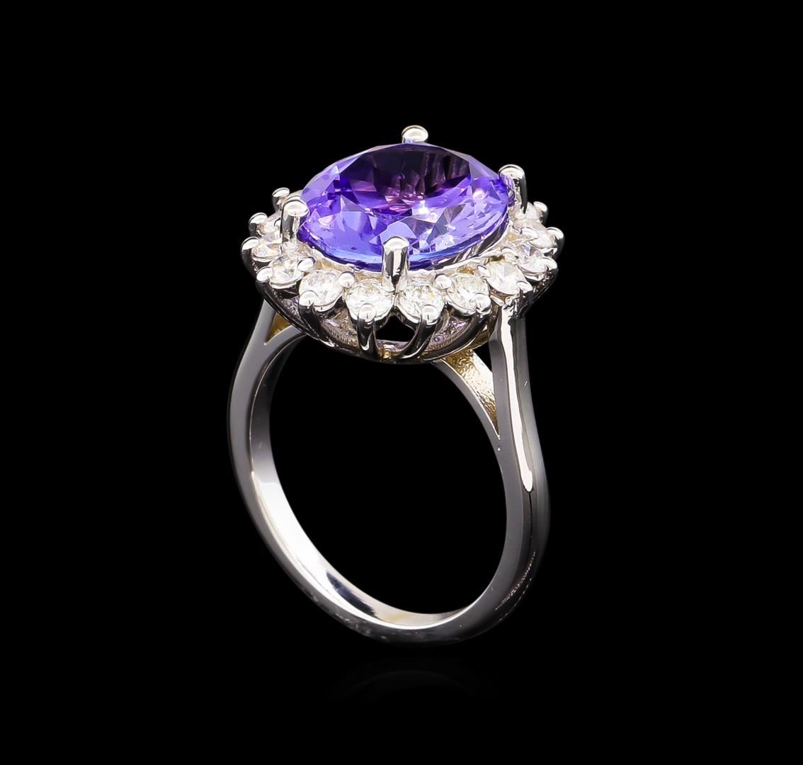 One electronically tested 14KT white gold lady's cast fashion ring with a basket halo with a bright polish finish. The featured lady's ring has a shank measuring 2.08 millimeters wide. Identified with markings of "14K". Condition is new, good workmanship. Containing: One prong set oval modified brilliant cut natural tanzanite, measuring 12.89 x 10.53 x 5.98mm, approximate weight of 5.67ct., clarity is eye clean, type I, medium, moderately strong, bluish violet color, (GIA bV 5/4), cut is very good. Transmitting light with no distortion, transparent. Colored gemstones are presumed to have been subjected to commonly used enhancement processes. Graded in the setting. Sixteen prong set round brilliant cut diamonds, measuring 2.40 - 2.30 x 1.46mm (depth est.) approximate total weight of 16 Stones = 0.80ct. Graded in the setting. Clarity: SI-1 to SI-2. Color: H - I. Cut Good. Total Weight of Colored Stones 5.67ct. Total Weight of Diamonds 0.80ct. Total Weight of Ring 6.50gm. GAS Appraised at $11,465.00.