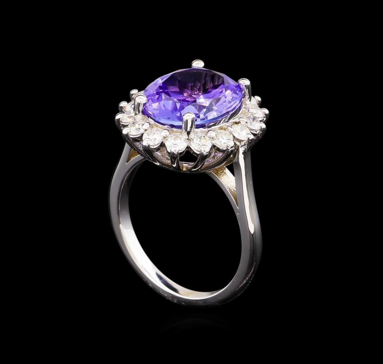 One electronically tested 14KT white gold lady's cast fashion ring with a basket halo with a bright polish finish. The featured lady's ring has a shank measuring 2.08 millimeters wide. Identified with markings of "14K". Condition is new, good workmanship. Containing: One prong set oval modified brilliant cut natural tanzanite, measuring 12.89 x 10.53 x 5.98mm, approximate weight of 5.67ct., clarity is eye clean, type I, medium, moderately strong, bluish violet color, (GIA bV 5/4), cut is very good. Transmitting light with no distortion, transparent. Colored gemstones are presumed to have been subjected to commonly used enhancement processes. Graded in the setting. Sixteen prong set round brilliant cut diamonds, measuring 2.40 - 2.30 x 1.46mm (depth est.) approximate total weight of 16 Stones = 0.80ct. Graded in the setting. Clarity: SI-1 to SI-2. Color: H - I. Cut Good. Total Weight of Colored Stones 5.67ct. Total Weight of Diamonds 0.80ct. Total Weight of Ring 6.50gm. GAS Appraised.