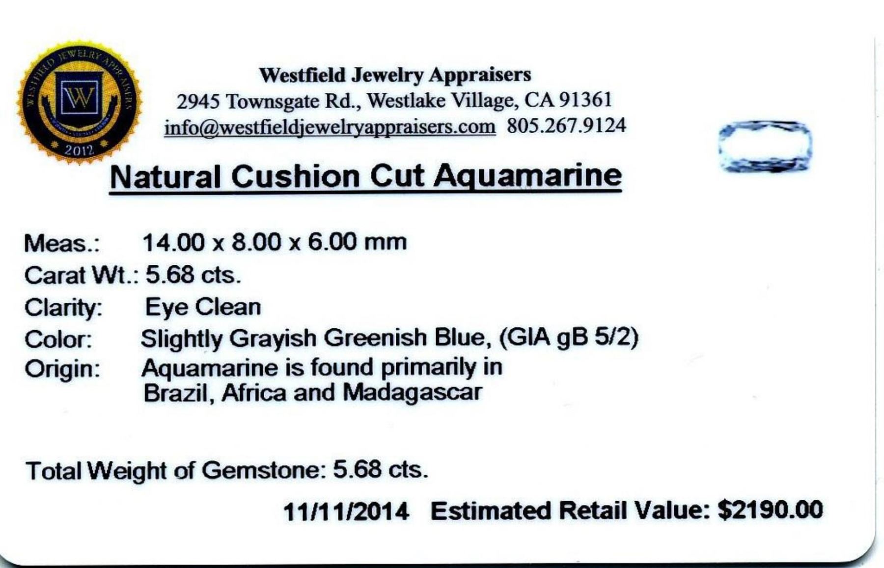 5.68ct. Natural Cushion Cut Aquamarine Westfield Appraised.