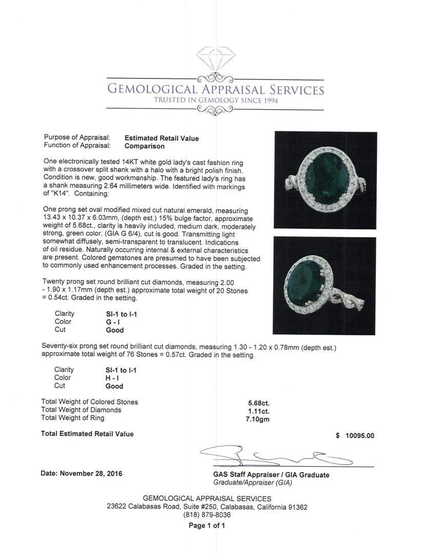 One electronically tested 14KT white gold lady's cast fashion ring with a crossover split shank with a halo with a bright polish finish. The featured lady's ring has a shank measuring 2.64 millimeters wide. Identified with markings of 'K14'. Condition is new, good workmanship. Containing: One prong set oval modified mixed cut natural emerald, measuring 13.43 x 10.37 x 6.03mm, (depth est.) 15%. bulge factor, approximate weight of 5.68ct., clarity is heavily included, medium dark, moderately strong, green color, (GIA G 6/4), cut is good. Transmitting light somewhat diffusely, semi-transparent to translucent. Indications of oil residue. Naturally occurring internal & external characteristics are present. Colored gemstones are presumed to have been subjected to commonly used enhancement processes. Graded in the setting. Twenty prong set round brilliant cut diamonds, measuring 2.00 - 1.90 x 1.17mm (depth est.) approximate total weight of 20 Stones = 0.54ct. Graded in the setting. Clarity SI-1 to I-1. Color: G - I Cut Good Seventy-Six prong set round brilliant cut diamonds, measuring 1.30 - 1.20 x 0.78mm (depth est.) approximate total weight of 76 Stones = 0.57ct. Graded in the setting. Clarity SI-1 to I-1. Color: H - I Cut Good. Total Weight of Colored Stones 5.68ct.. Total Weight of Diamonds 1.11ct.. Total Weight of Ring 7.10gm. GAS Appraised at $10,095.00.