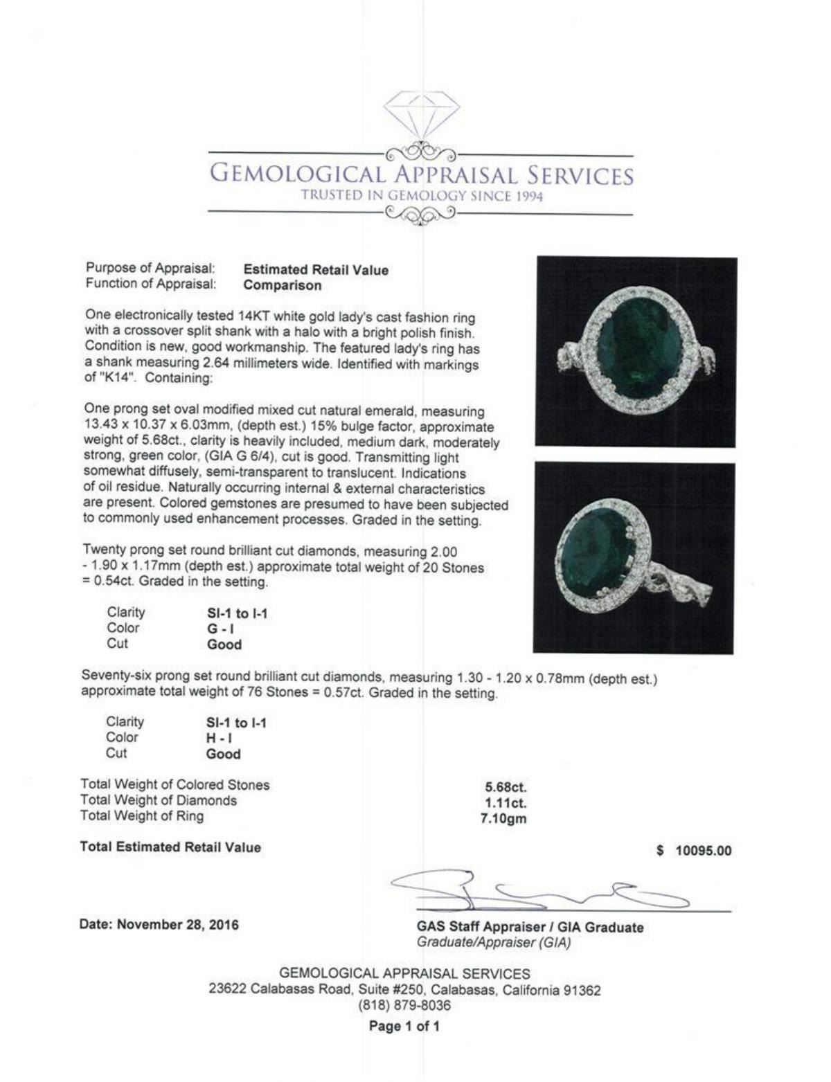 One electronically tested 14KT white gold lady's cast fashion ring with a crossover split shank with a halo with a bright polish finish. The featured lady's ring has a shank measuring 2.64 millimeters wide. Identified with markings of 'K14'. Condition is new, good workmanship. Containing: One prong set oval modified mixed cut natural emerald, measuring 13.43 x 10.37 x 6.03mm, (depth est.) 15%. bulge factor, approximate weight of 5.68ct., clarity is heavily included, medium dark, moderately strong, green color, (GIA G 6/4), cut is good. Transmitting light somewhat diffusely, semi-transparent to translucent. Indications of oil residue. Naturally occurring internal & external characteristics are present. Colored gemstones are presumed to have been subjected to commonly used enhancement processes. Graded in the setting. Twenty prong set round brilliant cut diamonds, measuring 2.00 - 1.90 x 1.17mm (depth est.) approximate total weight of 20 Stones = 0.54ct. Graded in the setting. Clarity SI-1 to I-1. Color: G - I Cut Good Seventy-Six prong set round brilliant cut diamonds, measuring 1.30 - 1.20 x 0.78mm (depth est.) approximate total weight of 76 Stones = 0.57ct. Graded in the setting. Clarity SI-1 to I-1. Color: H - I Cut Good. Total Weight of Colored Stones 5.68ct.. Total Weight of Diamonds 1.11ct.. Total Weight of Ring 7.10gm. GAS Appraised.