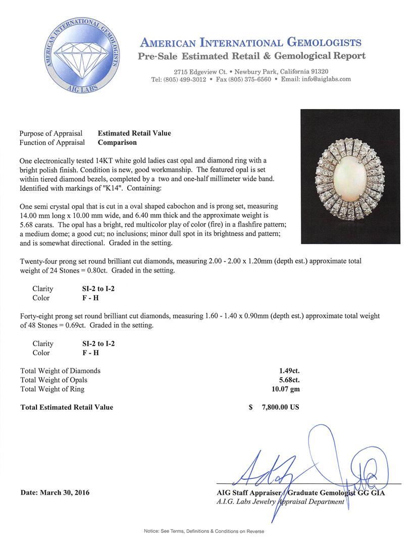 One electronically tested 14KT white gold ladies cast opal and diamond ring with a bright polish finish. The featured opal is set within tiered diamond bezels, completed by a two and one-half millimeter wide band. Identified with markings of "K14". Condition is new, good workmanship. Containing: One semi crystal opal that is cut in a oval shaped cabochon and is prong set, measuring 14.00 mm long x 10.00 mm wide, and 6.40 mm thick and the approximate weight is 5.68 carats. The opal has a bright, red multicolor play of color (fire) in a flashfire pattern; a medium dome; a good cut; no inclusions; minor dull spot in its brightness and pattern; and is somewhat directional. Graded in the setting. Twenty-Four prong set round brilliant cut diamonds, measuring 2.00 - 2.00 x 1.20mm (depth est.) approximate. Total Weight of 24 Stones = 0.80ct. Graded in the setting. Clarity: SI-2 to I-2. Color: F - H Forty-Eight prong set round brilliant cut diamonds, measuring 1.60 - 1.40 x 0.90mm (depth est.) approximate. Total Weight of 48 Stones = 0.69ct. Graded in the setting. Clarity: SI-2 to I-2. Color: F - H. Total Weight of Diamonds 1.49ct. Total Weight of Opals 5.68ct. Total Weight of Ring 10.07gm. AIG Appraised at $7,800.00.