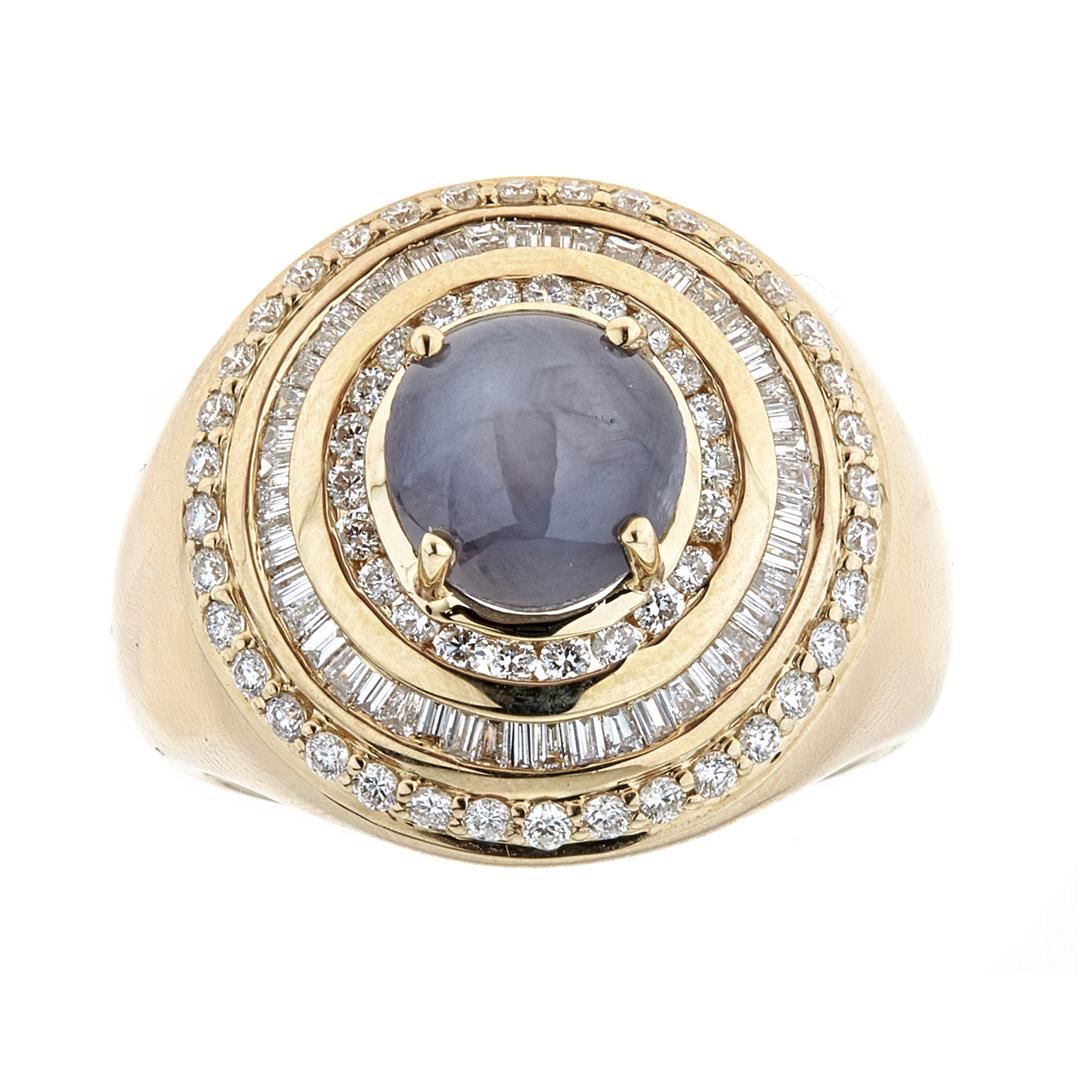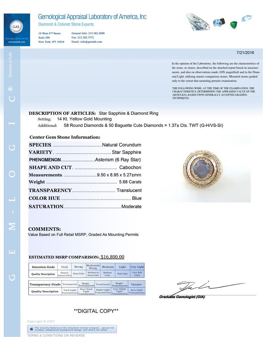 One Star Sapphire and Diamond Ring. Setting: 14 Kt. Yellow Gold Mounting. Additional: 58 Round Diamonds and 50 Baguette Cut Diamonds = 1.37 Cts. TWT (G-H/VS-SI). Center Gem Stone Information: Species: Natural Corundum. Variety: Star Sapphire. Phenomenon: Asterism (6 Ray Star). Shape and Cut: Cabochon. Measurements: 9.50 x 8.95 x 5.27 mm. Weight: 5.68 Carats. Transparency: Translucent. Color Hue: Blue. Saturation: Moderate. Total Weight: 17.5 grams.