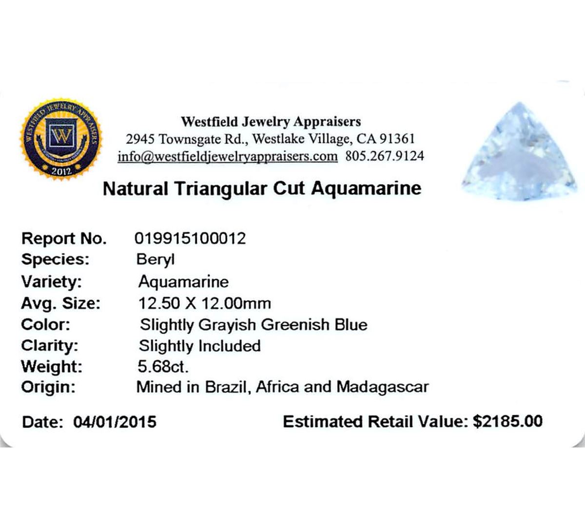One triangle cut natural aquamarine exact weight 5.68ct., clarity is slightly included, type I, medium, slightly grayish, very slightly greenish blue color, (GIA vslgB 5/2), cut is good. Westfield Appraised at $2,185.00.