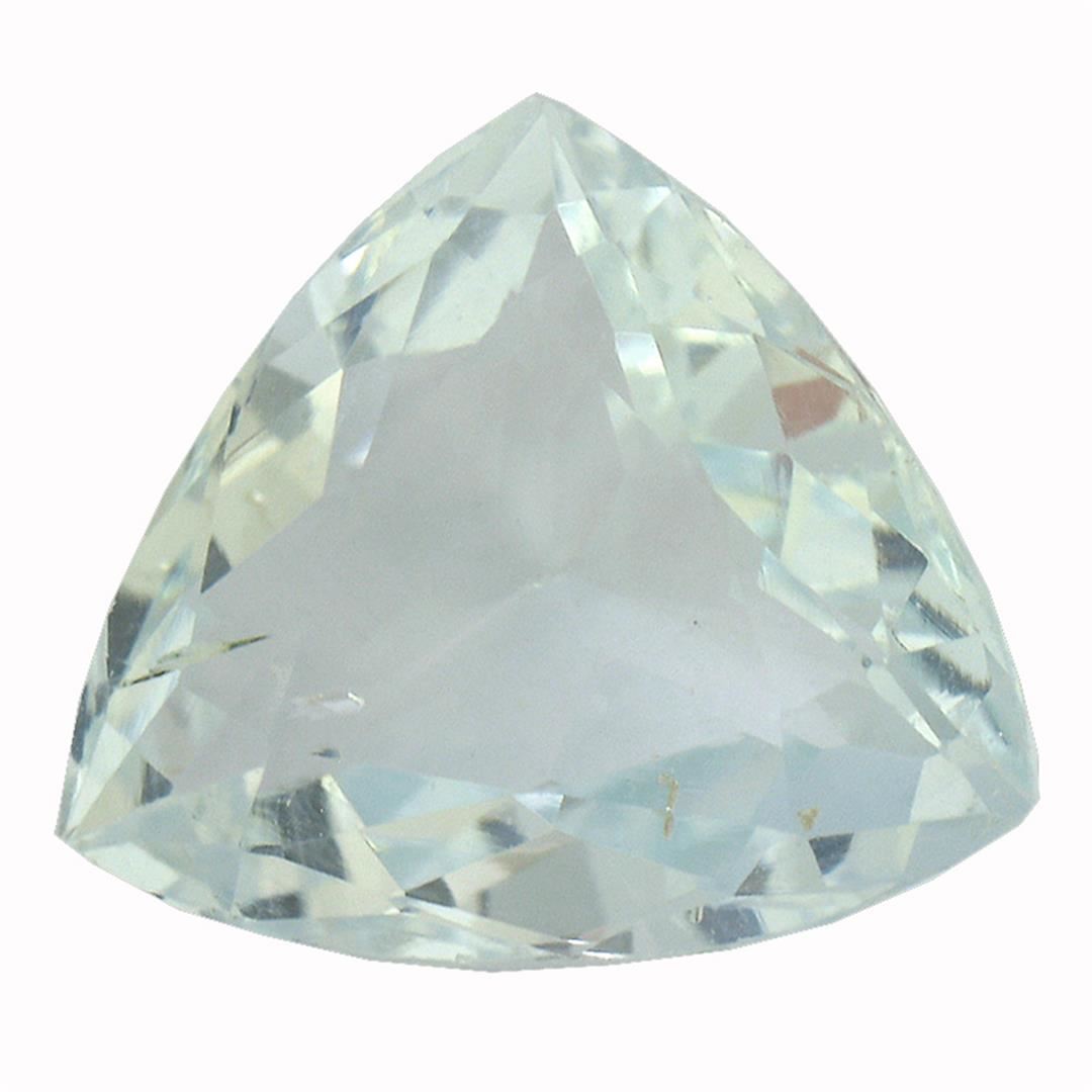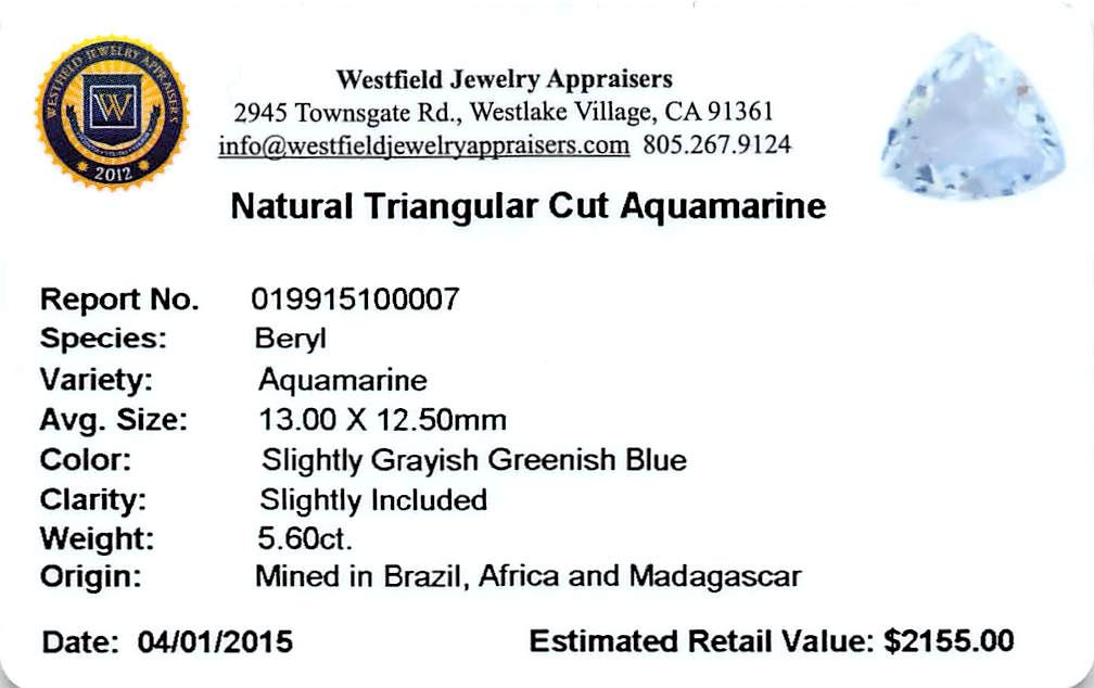 One triangle cut natural aquamarine exact weight 5.60ct., clarity is slightly included, type I, medium, slightly grayish, very slightly greenish blue color, (GIA vslgB 5/2), cut is good. Westfield Appraised at $2,155.00.