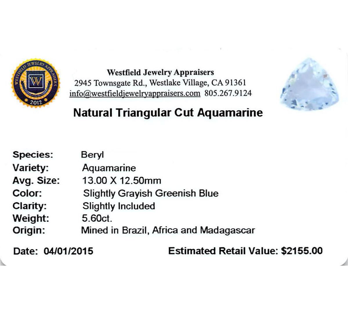One triangle cut natural aquamarine exact weight 5.60ct., clarity is slightly included, type I, medium, slightly grayish, very slightly greenish blue color, (GIA vslgB 5/2), cut is good. Westfield Appraised at $2,155.00.