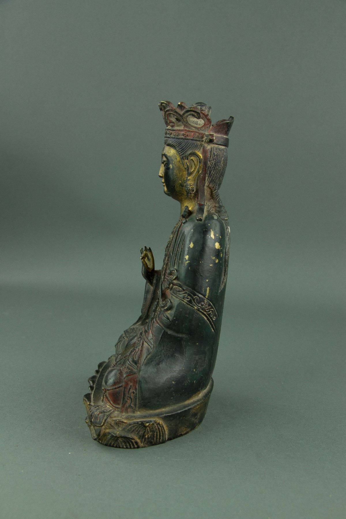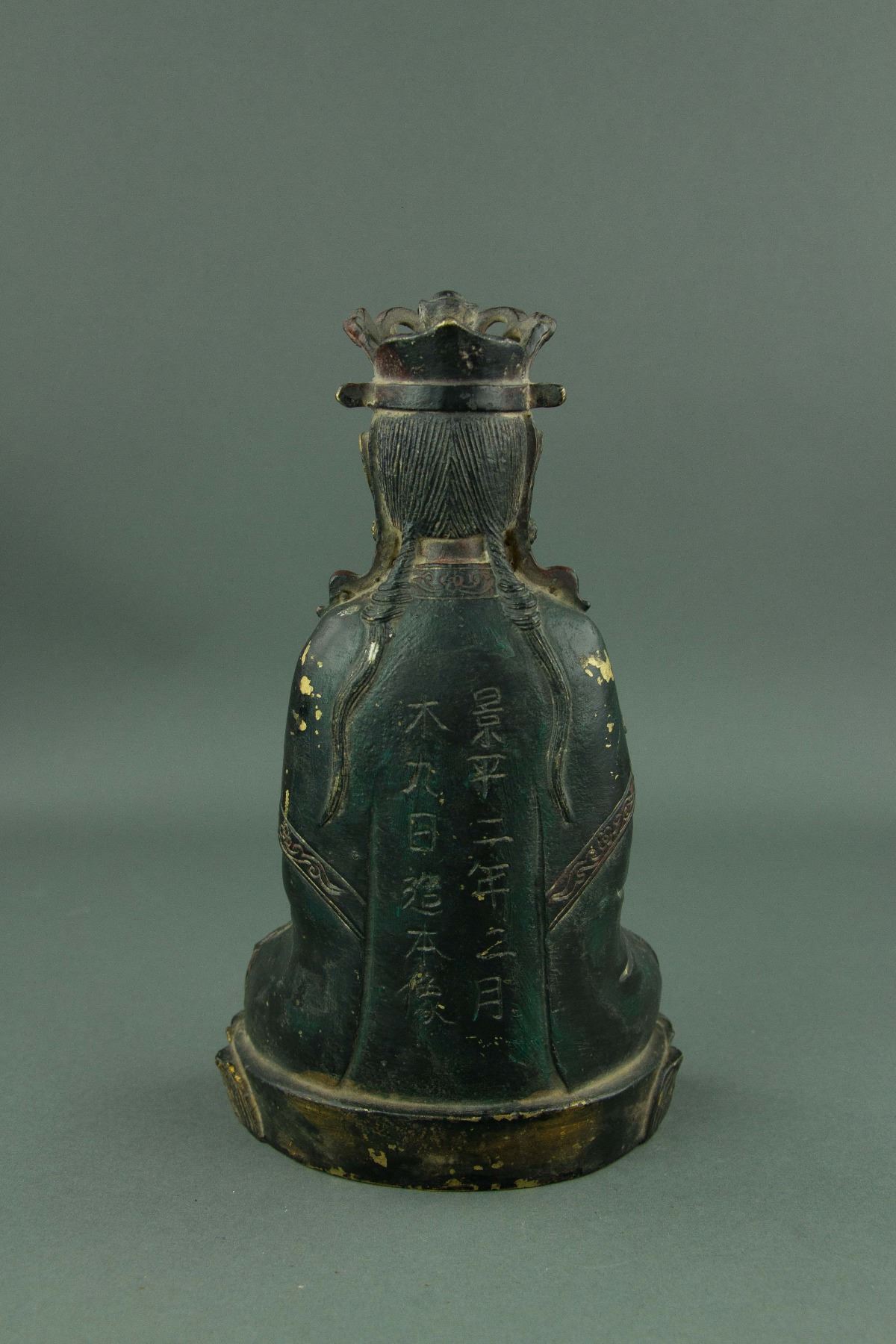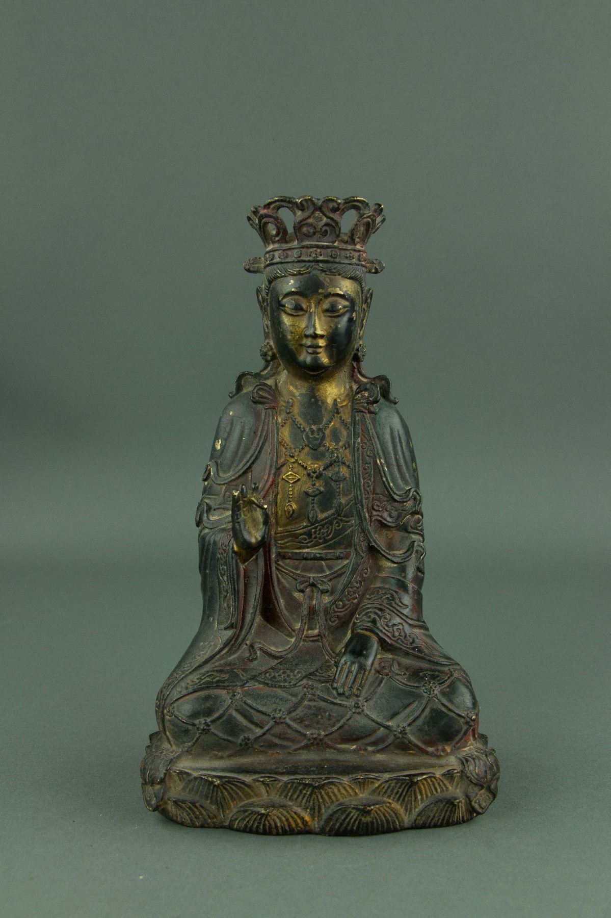 Northern Southern dynasties (420 to 589 AD) fine gilt bronze figure; cast with seated Kshitigarbha on lotus plinth; the back with Jingping (Liu Song dynasty) Second Year mark; H: 24 cm, W: 14 cm, 1893 grams