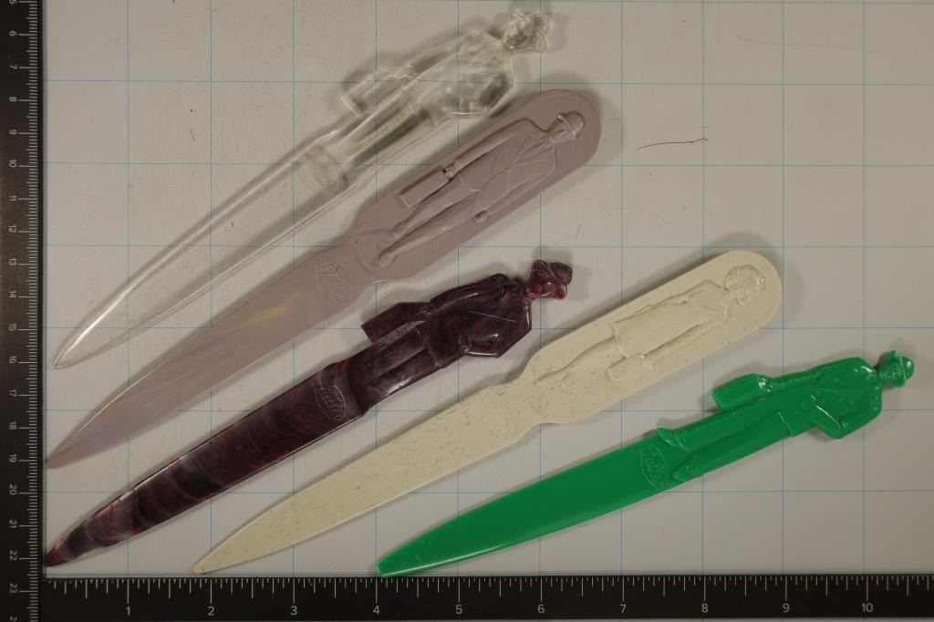 LETTER OPENERS ALL DIFFERENT COLORS. THE GREEN ONE IS MISSING THE TIP OF THE OPENER