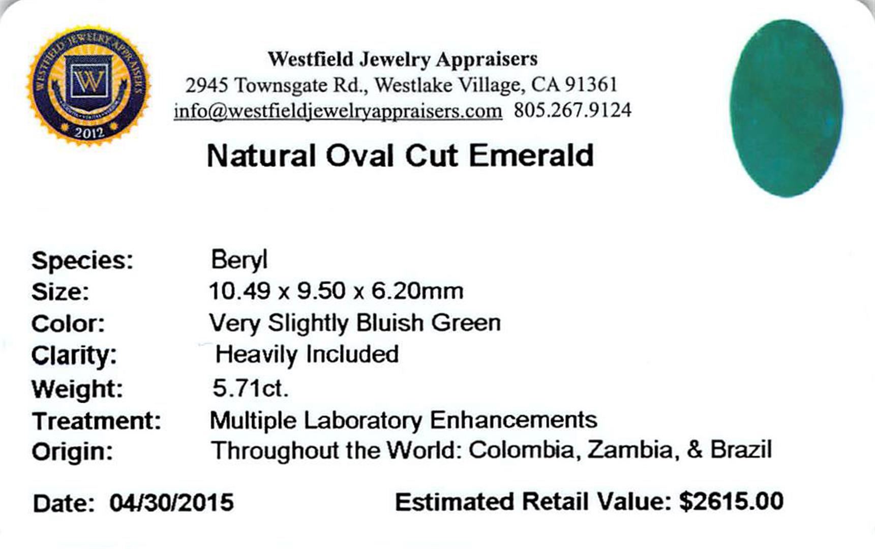 One oval cut natural emerald, measuring 10.49 x 9.50 x 6.20mm, exact weight 5.71ct., clarity is heavily included, type III, medium dark, very slightly grayish, very slightly bluish green color, (GIA vslbG 6/3), cut is good. Westfield Appraised at $2,615.00.