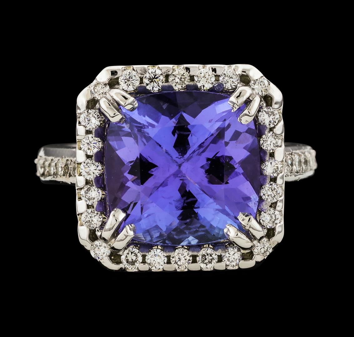 One electronically tested 14KT white gold lady's cast fashion ring with a square basket halo with a bright polish finish. The featured lady's ring has a shank measuring 2.72 millimeters wide. Identified with markings of '14K'. Condition is new, good workmanship. Containing: One prong set square cushion modified brilliant cut natural tanzanite, measuring 11.05 x 11.03 x 6.96mm, (depth est.) approximate weight of 5.71ct., clarity is eye clean, medium light, moderately strong, violet color, (GIA V 4/4), cut is good. Transmitting light with no distortion, transparent. Colored gemstones are presumed to have been subjected to commonly used enhancement processes. Graded in the setting. Twenty-Four prong set round brilliant cut diamonds, measuring 1.60 - 1.50 x 0.96mm (depth est.) approximate total weight of 24 Stones = 0.34ct. Graded in the setting. Clarity VS-2 to SI-2. Color: H - I Cut Good Twelve prong set round brilliant cut diamonds, measuring 1.40 - 1.35 x 0.86mm (depth est.) approximate total weight of 12 Stones = 0.12ct. Graded in the setting. Clarity VS-2 to SI-2. Color: H - I Cut Good. Total Weight of Colored Stones 5.71ct.. Total Weight of Diamonds 0.46ct.. Total Weight of Ring 7.00gm. GAS Appraised at $7,595.00.
