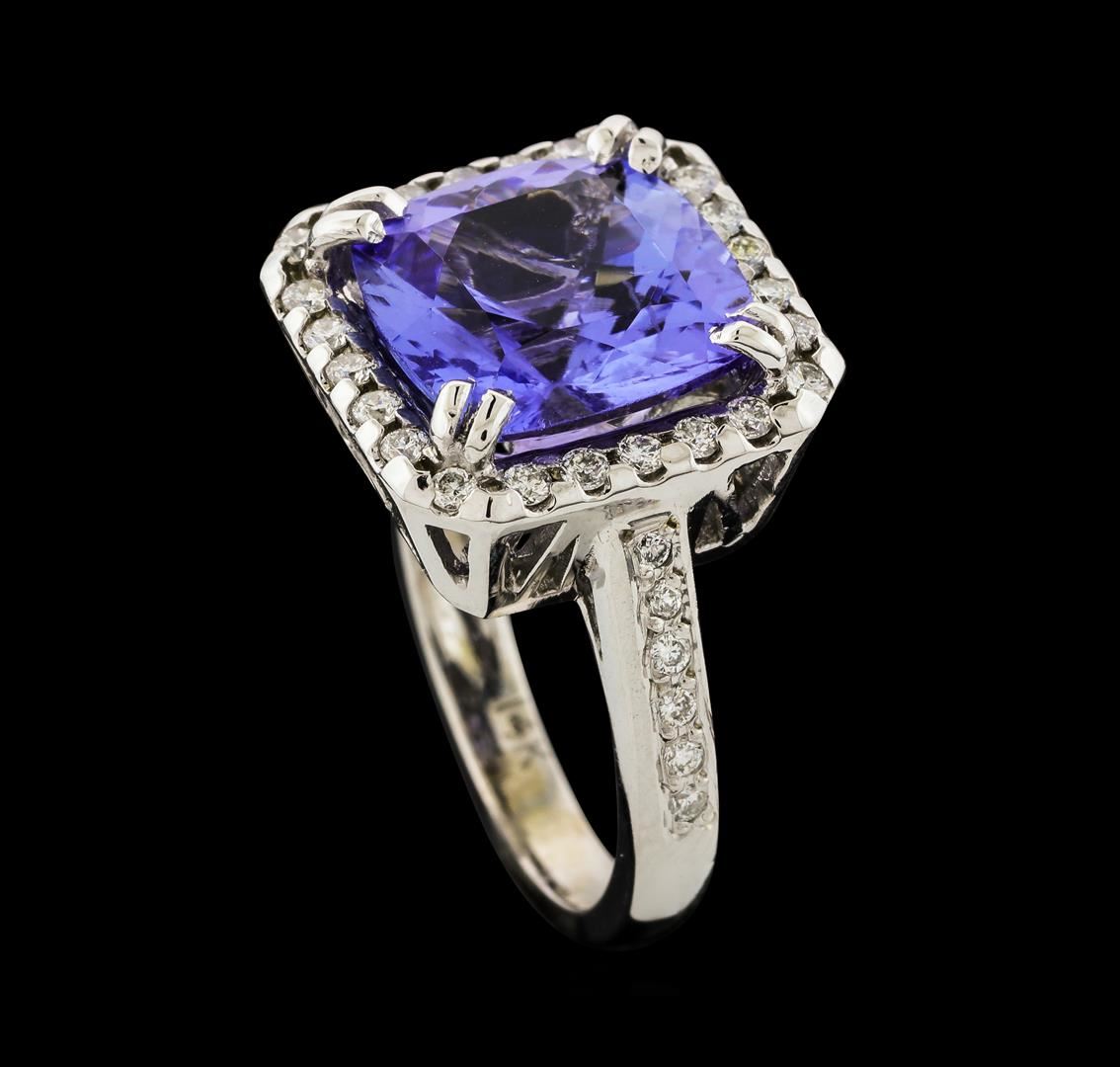 One electronically tested 14KT white gold lady's cast fashion ring with a square basket halo with a bright polish finish. The featured lady's ring has a shank measuring 2.72 millimeters wide. Identified with markings of '14K'. Condition is new, good workmanship. Containing: One prong set square cushion modified brilliant cut natural tanzanite, measuring 11.05 x 11.03 x 6.96mm, (depth est.) approximate weight of 5.71ct., clarity is eye clean, medium light, moderately strong, violet color, (GIA V 4/4), cut is good. Transmitting light with no distortion, transparent. Colored gemstones are presumed to have been subjected to commonly used enhancement processes. Graded in the setting. Twenty-Four prong set round brilliant cut diamonds, measuring 1.60 - 1.50 x 0.96mm (depth est.) approximate total weight of 24 Stones = 0.34ct. Graded in the setting. Clarity VS-2 to SI-2. Color: H - I Cut Good Twelve prong set round brilliant cut diamonds, measuring 1.40 - 1.35 x 0.86mm (depth est.) approximate total weight of 12 Stones = 0.12ct. Graded in the setting. Clarity VS-2 to SI-2. Color: H - I Cut Good. Total Weight of Colored Stones 5.71ct.. Total Weight of Diamonds 0.46ct.. Total Weight of Ring 7.00gm. GAS Appraised at $7,595.00.