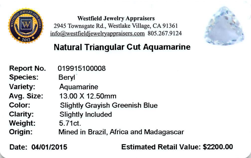 One triangle cut natural aquamarine exact weight 5.71ct., clarity is slightly included, type I, medium, slightly grayish, very slightly greenish blue color, (GIA vslgB 5/2), cut is good. Westfield Appraised at $2,200.00.
