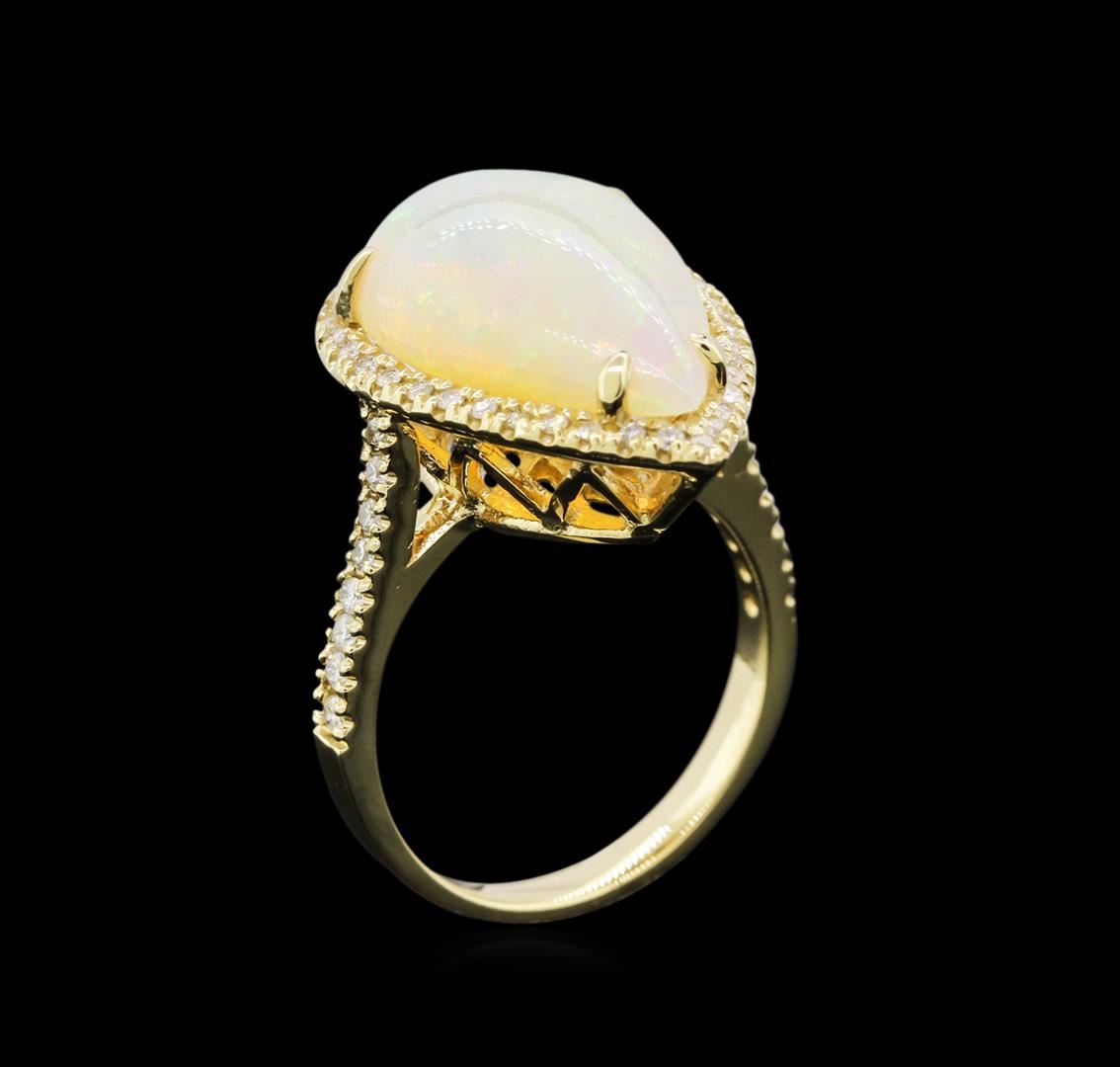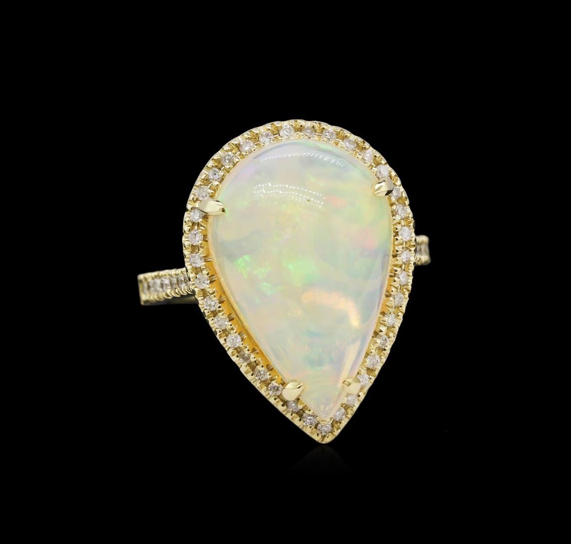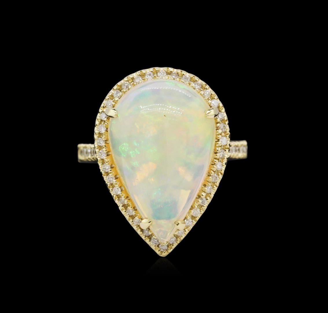 One 14K Yellow Gold Lady's Ring. 6.80 GR. Containing: Main Gemstones: Identity: Opal. Carat Weight 5.72 CTS TW. Shape & Measurement: Pear Shape. Quality: Fine Color. Adjacent Gemstones: Identity: Natural Diamond. Shape: Round Cut. Carat Weight: 0.34CTS TW. Quality: SI Clarity, G-H Color. All Fine Cutting And Proportions. Total Gemstones Weight: 6.06 CTW TW. RBGS Appraised.