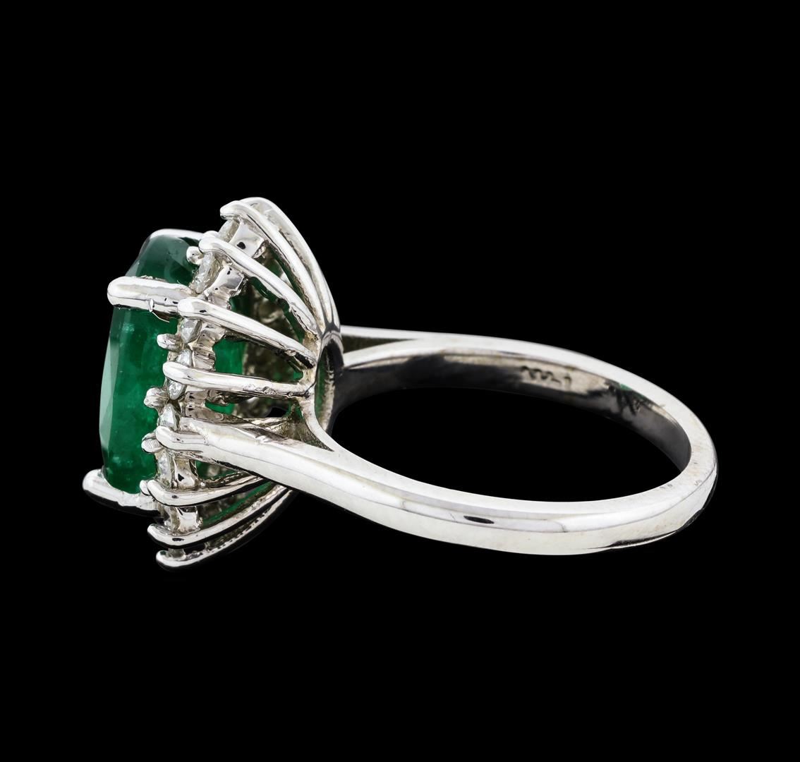 One electronically tested 14KT white gold lady's cast fashion ring with a basket halo with a bright polish finish. The featured lady's ring has a shank measuring 2.08 millimeters wide. Identified with markings of '14K'. Condition is new, good workmanship. Containing: One prong set oval modified mixed cut natural emerald, measuring 12.58 x 9.74 x 5.86mm, (depth est.) 15%. bulge factor, approximate weight of 4.93ct., clarity is heavily included, medium, moderately strong, green color, (GIA G 5/4), cut is good. Transmitting light somewhat diffusely, semi-transparent to translucent. Naturally occurring internal & external characteristics are present. Indications of oil residue. Colored gemstones are presumed to have been subjected to commonly used enhancement processes. Graded in the setting. Sixteen prong set round brilliant cut diamonds, measuring 2.40 - 2.30 x 1.46mm (depth est.) approximate total weight of 16 Stones = 0.80ct. Graded in the setting. Clarity SI-1 to I-1. Color: G - H Cut Good. Total Weight of Colored Stones 4.93ct.. Total Weight of Diamonds 0.80ct.. Total Weight of Ring 6.40gm. GAS Appraised at $7,935.00.