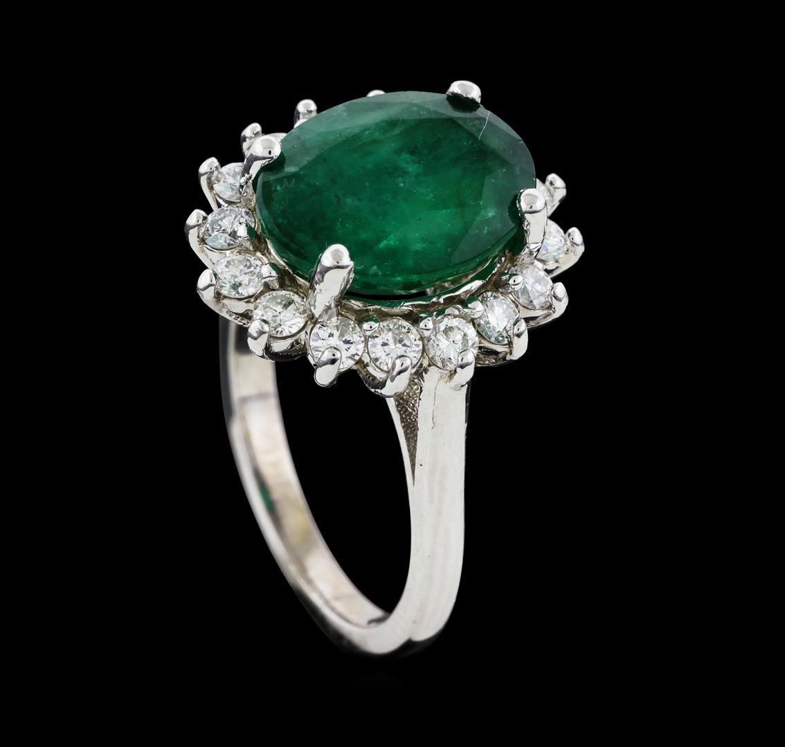 One electronically tested 14KT white gold lady's cast fashion ring with a basket halo with a bright polish finish. The featured lady's ring has a shank measuring 2.08 millimeters wide. Identified with markings of '14K'. Condition is new, good workmanship. Containing: One prong set oval modified mixed cut natural emerald, measuring 12.58 x 9.74 x 5.86mm, (depth est.) 15%. bulge factor, approximate weight of 4.93ct., clarity is heavily included, medium, moderately strong, green color, (GIA G 5/4), cut is good. Transmitting light somewhat diffusely, semi-transparent to translucent. Naturally occurring internal & external characteristics are present. Indications of oil residue. Colored gemstones are presumed to have been subjected to commonly used enhancement processes. Graded in the setting. Sixteen prong set round brilliant cut diamonds, measuring 2.40 - 2.30 x 1.46mm (depth est.) approximate total weight of 16 Stones = 0.80ct. Graded in the setting. Clarity SI-1 to I-1. Color: G - H Cut Good. Total Weight of Colored Stones 4.93ct.. Total Weight of Diamonds 0.80ct.. Total Weight of Ring 6.40gm. GAS Appraised at $7,935.00.