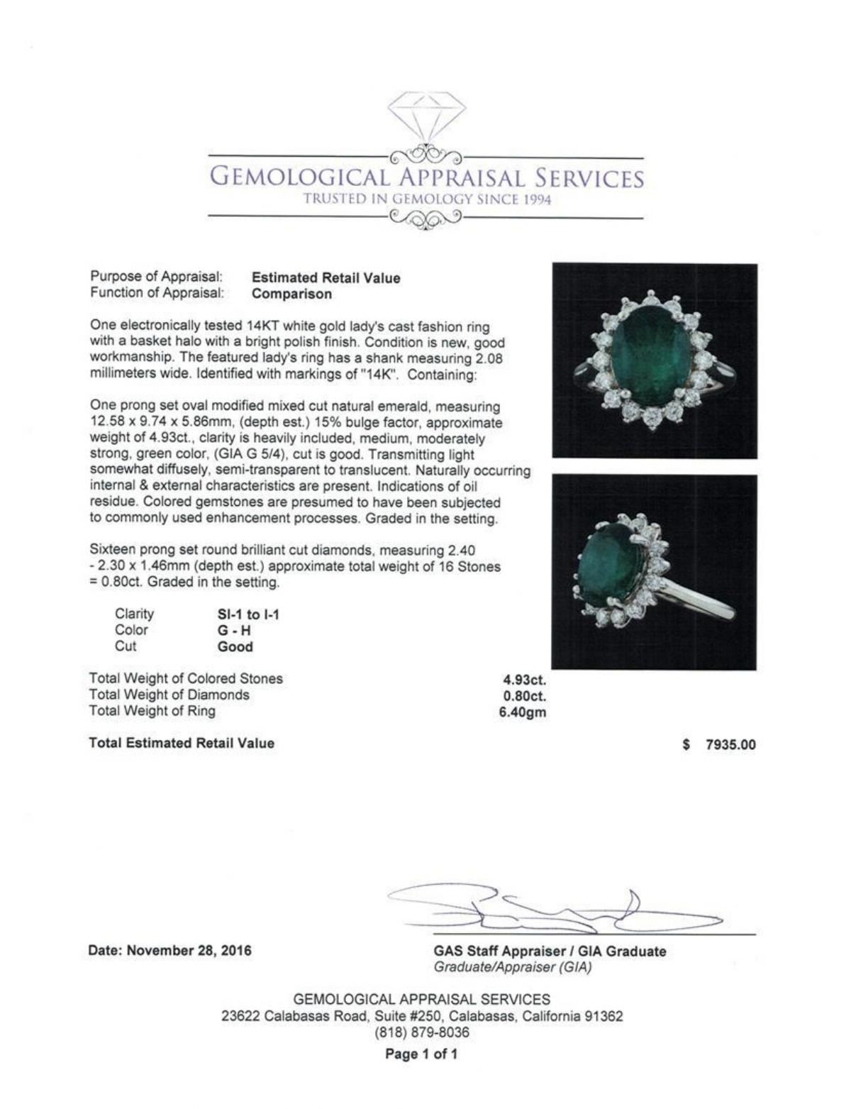 One electronically tested 14KT white gold lady's cast fashion ring with a basket halo with a bright polish finish. The featured lady's ring has a shank measuring 2.08 millimeters wide. Identified with markings of '14K'. Condition is new, good workmanship. Containing: One prong set oval modified mixed cut natural emerald, measuring 12.58 x 9.74 x 5.86mm, (depth est.) 15%. bulge factor, approximate weight of 4.93ct., clarity is heavily included, medium, moderately strong, green color, (GIA G 5/4), cut is good. Transmitting light somewhat diffusely, semi-transparent to translucent. Naturally occurring internal & external characteristics are present. Indications of oil residue. Colored gemstones are presumed to have been subjected to commonly used enhancement processes. Graded in the setting. Sixteen prong set round brilliant cut diamonds, measuring 2.40 - 2.30 x 1.46mm (depth est.) approximate total weight of 16 Stones = 0.80ct. Graded in the setting. Clarity SI-1 to I-1. Color: G - H Cut Good. Total Weight of Colored Stones 4.93ct.. Total Weight of Diamonds 0.80ct.. Total Weight of Ring 6.40gm. GAS Appraised.
