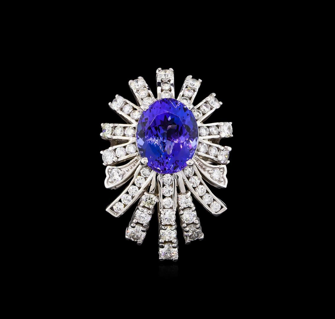 One electronically tested 14KT white gold lady's cast fashion ring with a basket halo with a bright polish finish. The featured lady's ring has a shank measuring 2.72 millimeters wide. Identified with markings of "K14". Condition is new, good workmanship. Containing: One prong set oval modified brilliant cut natural tanzanite, measuring 12.18 x 9.93 x 6.80mm, approximate weight of 5.73ct., clarity is eye clean, type I, medium, moderately strong, violetish blue color, (GIA vB 5/4), cut is very good. Transmitting light with no distortion, transparent. Colored gemstones are presumed to have been subjected to commonly used enhancement processes. Graded in the setting. Twenty prong set round brilliant cut diamonds, measuring 3.00 - 2.30 x 1.64mm (depth est.) approximate total weight of 20 Stones = 1.44ct. Graded in the setting. Clarity: SI-1 to SI-2. Color: H - I. Cut Good Thirty-One channel set round brilliant cut diamonds, measuring 1.70 - 1.65 x 1.04mm (depth est.) approximate total weight of 31 Stones = 0.55ct. Graded in the setting. Clarity: SI-1 to SI-2. Color: H - I. Cut Good. Total Weight of Colored Stones 5.73ct. Total Weight of Diamonds 1.99ct. Total Weight of Ring 10.40gm. GAS Appraised at $15,175.00.
