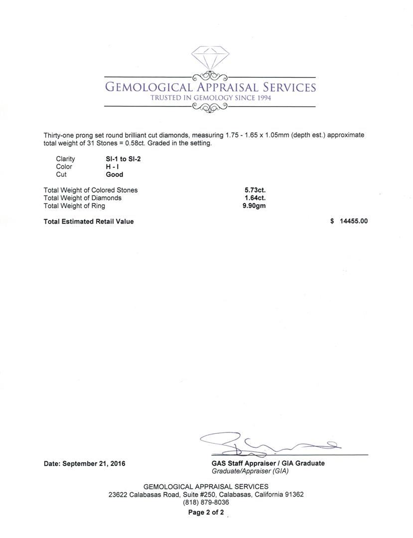 One electronically tested 14KT white gold lady's cast fashion ring with a bright polish finish. The featured lady's ring has a starburst motif and a shank measuring 2.48 millimeters wide. Identified with markings of 'K14'. Condition is new, good workmanship. Containing: One prong set oval modified brilliant cut natural tanzanite, measuring 13.88 x 9.80 x 5.63mm, (depth est.) 6%. bulge factor, approximate total weight of 5.73ct., clarity is eye clean, medium, moderately strong, violetish blue color, (GIA vB 5/4), cut is very good. Transmitting light with no distortion, transparent. Colored gemstones are presumed to have been subjected to commonly used enhancement processes. Graded in the setting. Three prong set round brilliant cut diamonds, measuring 3.00 - 2.90 x 1.77mm (depth est.) approximate total weight of 3 Stones = 0.28ct. Graded in the setting. Clarity SI-1 to SI-2. Color: H - I Cut Good Three prong set round brilliant cut diamonds, measuring 2.70 - 2.60 x 1.59mm (depth est.) approximate total weight of 3 Stones = 0.20ct. Graded in the setting. Clarity SI-1 to SI-2. Color: H - I Cut Good Fourteen prong set round brilliant cut diamonds, measuring 2.30 - 2.20 x 1.35mm (depth est.) approximate total weight of 14 Stones = 0.58ct. Graded in the setting. Clarity SI-1 to SI-2. Color: H - I Cut Good Thirty-One prong set round brilliant cut diamonds, measuring 1.75 - 1.65 x 1.05mm (depth est.) approximate total weight of 31 Stones = 0.58ct. Graded in the setting. Clarity SI-1 to SI-2. Color: H - I Cut Good. Total Weight of Colored Stones 5.73ct.. Total Weight of Diamonds 1.64ct.. Total Weight of Ring 9.90gm. GAS Appraised at $14,455.00.