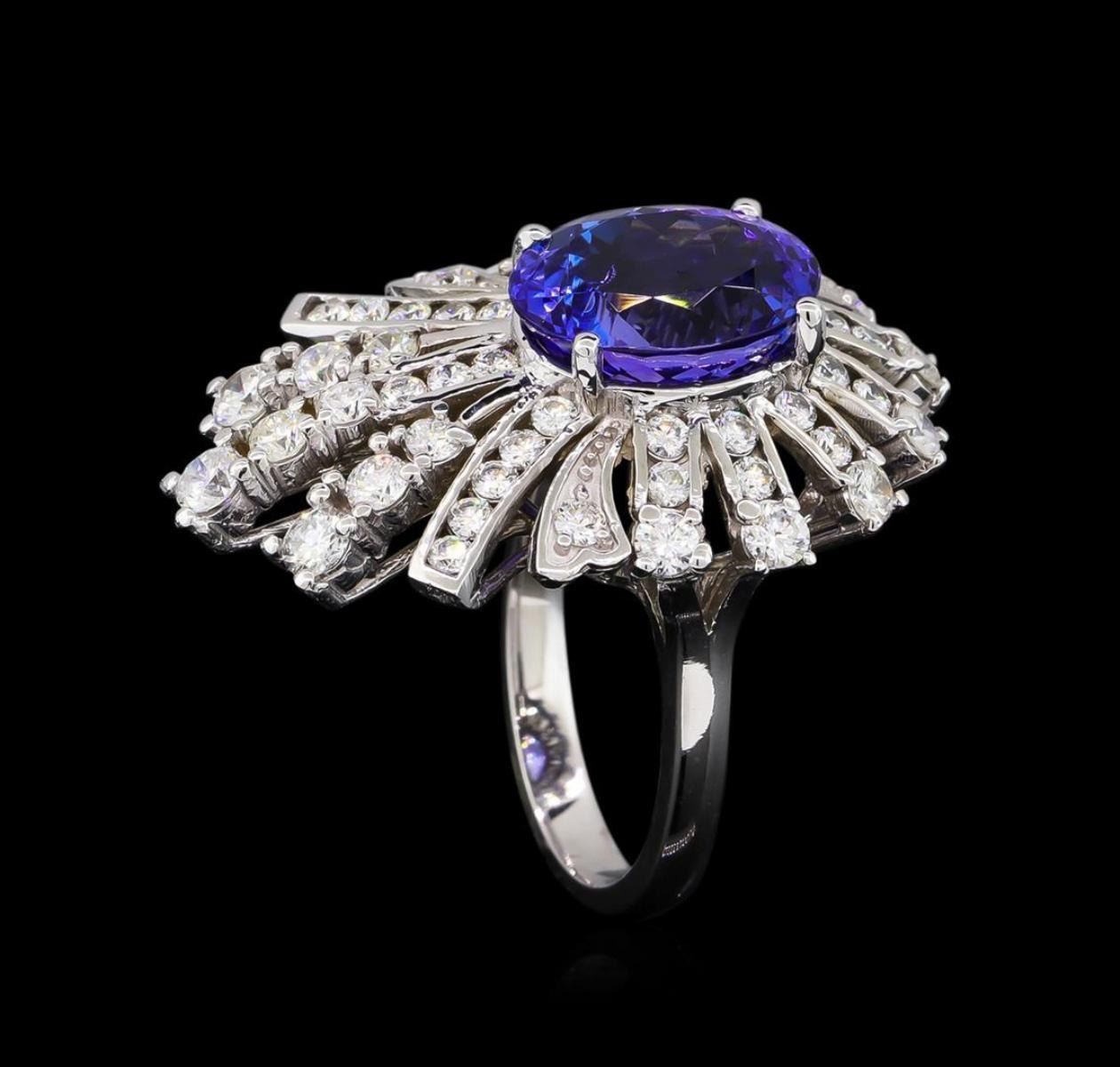 One electronically tested 14KT white gold lady's cast fashion ring with a basket halo with a bright polish finish. The featured lady's ring has a shank measuring 2.72 millimeters wide. Identified with markings of "K14". Condition is new, good workmanship. Containing: One prong set oval modified brilliant cut natural tanzanite, measuring 12.18 x 9.93 x 6.80mm, approximate weight of 5.73ct., clarity is eye clean, type I, medium, moderately strong, violetish blue color, (GIA vB 5/4), cut is very good. Transmitting light with no distortion, transparent. Colored gemstones are presumed to have been subjected to commonly used enhancement processes. Graded in the setting. Twenty prong set round brilliant cut diamonds, measuring 3.00 - 2.30 x 1.64mm (depth est.) approximate total weight of 20 Stones = 1.44ct. Graded in the setting. Clarity: SI-1 to SI-2. Color: H - I. Cut Good Thirty-One channel set round brilliant cut diamonds, measuring 1.70 - 1.65 x 1.04mm (depth est.) approximate total weight of 31 Stones = 0.55ct. Graded in the setting. Clarity: SI-1 to SI-2. Color: H - I. Cut Good. Total Weight of Colored Stones 5.73ct. Total Weight of Diamonds 1.99ct. Total Weight of Ring 10.40gm. GAS Appraised.