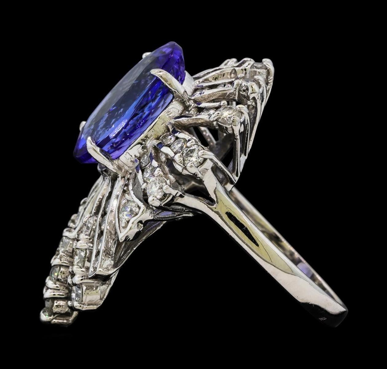 One electronically tested 14KT white gold lady's cast fashion ring with a bright polish finish. The featured lady's ring has a starburst motif and a shank measuring 2.48 millimeters wide. Identified with markings of 'K14'. Condition is new, good workmanship. Containing: One prong set oval modified brilliant cut natural tanzanite, measuring 13.88 x 9.80 x 5.63mm, (depth est.) 6%. bulge factor, approximate total weight of 5.73ct., clarity is eye clean, medium, moderately strong, violetish blue color, (GIA vB 5/4), cut is very good. Transmitting light with no distortion, transparent. Colored gemstones are presumed to have been subjected to commonly used enhancement processes. Graded in the setting. Three prong set round brilliant cut diamonds, measuring 3.00 - 2.90 x 1.77mm (depth est.) approximate total weight of 3 Stones = 0.28ct. Graded in the setting. Clarity SI-1 to SI-2. Color: H - I Cut Good Three prong set round brilliant cut diamonds, measuring 2.70 - 2.60 x 1.59mm (depth est.) approximate total weight of 3 Stones = 0.20ct. Graded in the setting. Clarity SI-1 to SI-2. Color: H - I Cut Good Fourteen prong set round brilliant cut diamonds, measuring 2.30 - 2.20 x 1.35mm (depth est.) approximate total weight of 14 Stones = 0.58ct. Graded in the setting. Clarity SI-1 to SI-2. Color: H - I Cut Good Thirty-One prong set round brilliant cut diamonds, measuring 1.75 - 1.65 x 1.05mm (depth est.) approximate total weight of 31 Stones = 0.58ct. Graded in the setting. Clarity SI-1 to SI-2. Color: H - I Cut Good. Total Weight of Colored Stones 5.73ct.. Total Weight of Diamonds 1.64ct.. Total Weight of Ring 9.90gm. GAS Appraised.