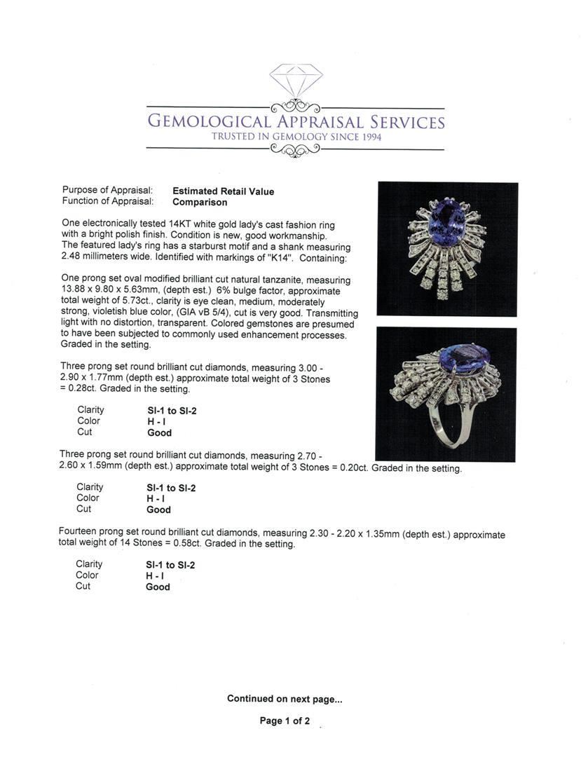 One electronically tested 14KT white gold lady's cast fashion ring with a bright polish finish. The featured lady's ring has a starburst motif and a shank measuring 2.48 millimeters wide. Identified with markings of 'K14'. Condition is new, good workmanship. Containing: One prong set oval modified brilliant cut natural tanzanite, measuring 13.88 x 9.80 x 5.63mm, (depth est.) 6%. bulge factor, approximate total weight of 5.73ct., clarity is eye clean, medium, moderately strong, violetish blue color, (GIA vB 5/4), cut is very good. Transmitting light with no distortion, transparent. Colored gemstones are presumed to have been subjected to commonly used enhancement processes. Graded in the setting. Three prong set round brilliant cut diamonds, measuring 3.00 - 2.90 x 1.77mm (depth est.) approximate total weight of 3 Stones = 0.28ct. Graded in the setting. Clarity SI-1 to SI-2. Color: H - I Cut Good Three prong set round brilliant cut diamonds, measuring 2.70 - 2.60 x 1.59mm (depth est.) approximate total weight of 3 Stones = 0.20 ct. Graded in the setting. Clarity SI-1 to SI-2. Color: H - I Cut Good Fourteen prong set round brilliant cut diamonds, measuring 2.30 - 2.20 x 1.35mm (depth est.) approximate total weight of 14 Stones = 0.58ct. Graded in the setting. Clarity SI-1 to SI-2. Color: H - I Cut Good Thirty-One prong set round brilliant cut diamonds, measuring 1.75 - 1.65 x 1.05mm (depth est.) approximate total weight of 31 Stones = 0.58ct. Graded in the setting. Clarity SI-1 to SI-2. Color: H - I Cut Good. Total Weight of Colored Stones 5.73ct.. Total Weight of Diamonds 1.64ct.. Total Weight of Ring 9.90gm. GAS Appraised.
