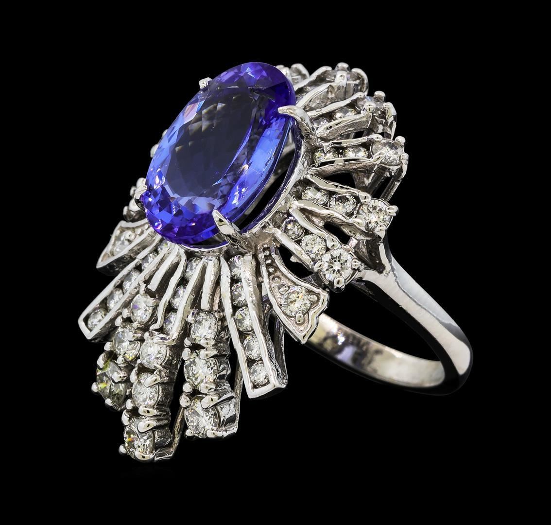 One electronically tested 14KT white gold lady's cast fashion ring with a bright polish finish. The featured lady's ring has a starburst motif and a shank measuring 2.48 millimeters wide. Identified with markings of 'K14'. Condition is new, good workmanship. Containing: One prong set oval modified brilliant cut natural tanzanite, measuring 13.88 x 9.80 x 5.63mm, (depth est.) 6%. bulge factor, approximate total weight of 5.73ct., clarity is eye clean, medium, moderately strong, violetish blue color, (GIA vB 5/4), cut is very good. Transmitting light with no distortion, transparent. Colored gemstones are presumed to have been subjected to commonly used enhancement processes. Graded in the setting. Three prong set round brilliant cut diamonds, measuring 3.00 - 2.90 x 1.77mm (depth est.) approximate total weight of 3 Stones = 0.28ct. Graded in the setting. Clarity SI-1 to SI-2. Color: H - I Cut Good Three prong set round brilliant cut diamonds, measuring 2.70 - 2.60 x 1.59mm (depth est.) approximate total weight of 3 Stones = 0.20 ct. Graded in the setting. Clarity SI-1 to SI-2. Color: H - I Cut Good Fourteen prong set round brilliant cut diamonds, measuring 2.30 - 2.20 x 1.35mm (depth est.) approximate total weight of 14 Stones = 0.58ct. Graded in the setting. Clarity SI-1 to SI-2. Color: H - I Cut Good Thirty-One prong set round brilliant cut diamonds, measuring 1.75 - 1.65 x 1.05mm (depth est.) approximate total weight of 31 Stones = 0.58ct. Graded in the setting. Clarity SI-1 to SI-2. Color: H - I Cut Good. Total Weight of Colored Stones 5.73ct.. Total Weight of Diamonds 1.64ct.. Total Weight of Ring 9.90gm. GAS Appraised.